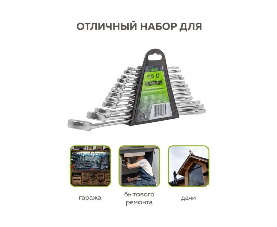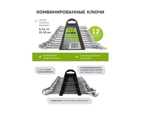 Набор комбинированных ключей изготовлен из хромованадиевой стали. Накидные ключи имеют 12 граней, которые увеличивают соприкосновения рабочих поверхностей. Многофункциональные ключи справятся с любой задачей - ремонт и сборка автомобиля, велосипеда, мототехники и садовой техники. Ключи фиксируются на полотне, которое имеет специальные отверстия в верхних углах полотна, для фиксации его на стене.