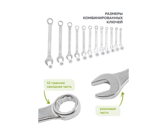 -Ключи комбинированные: (6, 7, 8, 9, 10, 11, 12, 13, 14, 17, 19, 22 мм) - 12 шт.