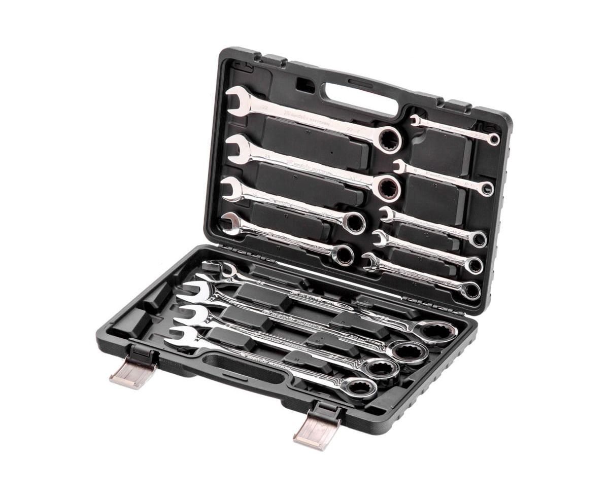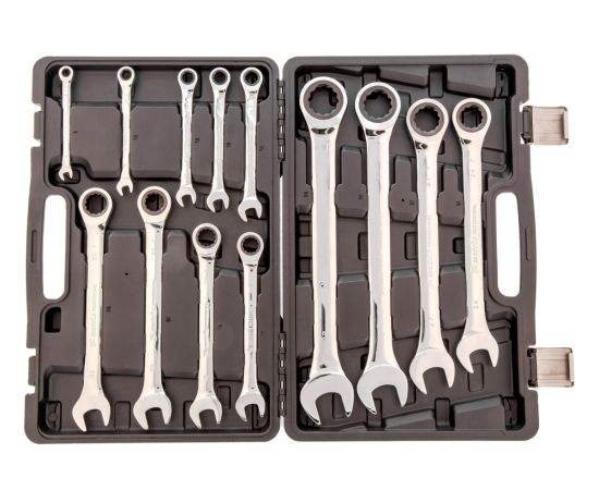 Набор комбинированных трещоточных ключей представлен в оптимальной комплектации и содержит популярный размерный ряд. Используется для работы с резьбовыми соединениями.