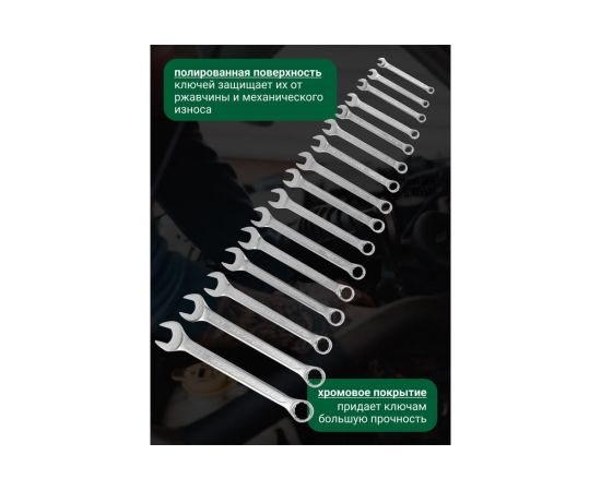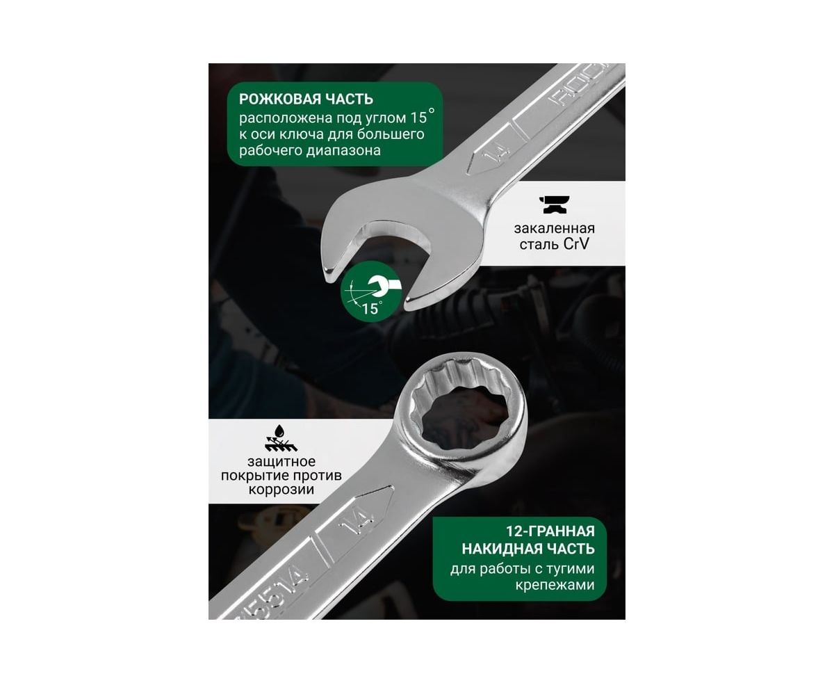 Набор ключей комбинированных, 16 предметов от бренда ROCKFORCE - ручной инструмент для работы с различными резьбовыми соединениями. Накидная часть применяется для работы с тугими крепежными соединениями, а рожковая применятся, если нет возможности накинуть ключ на соединение сверху - в таком случае можно работать с какой-то из сторон рожковым гаечным ключом.