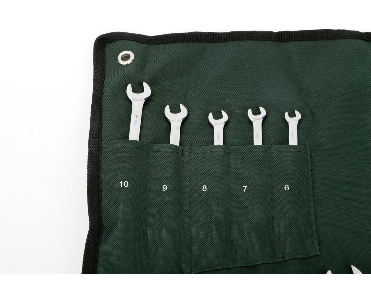 Набор комбинированных ключей с накидным наконечником включает в себя большое количество двусторонних ручных инструментов с кольцевыми и рожковыми головками для выполнения крепежных операций в широком диапазоне размерности болтов и гаек. Набор очень прост в хранении и транспортировке благодаря удобному чехлу с отдельными карманами для каждого компонента.