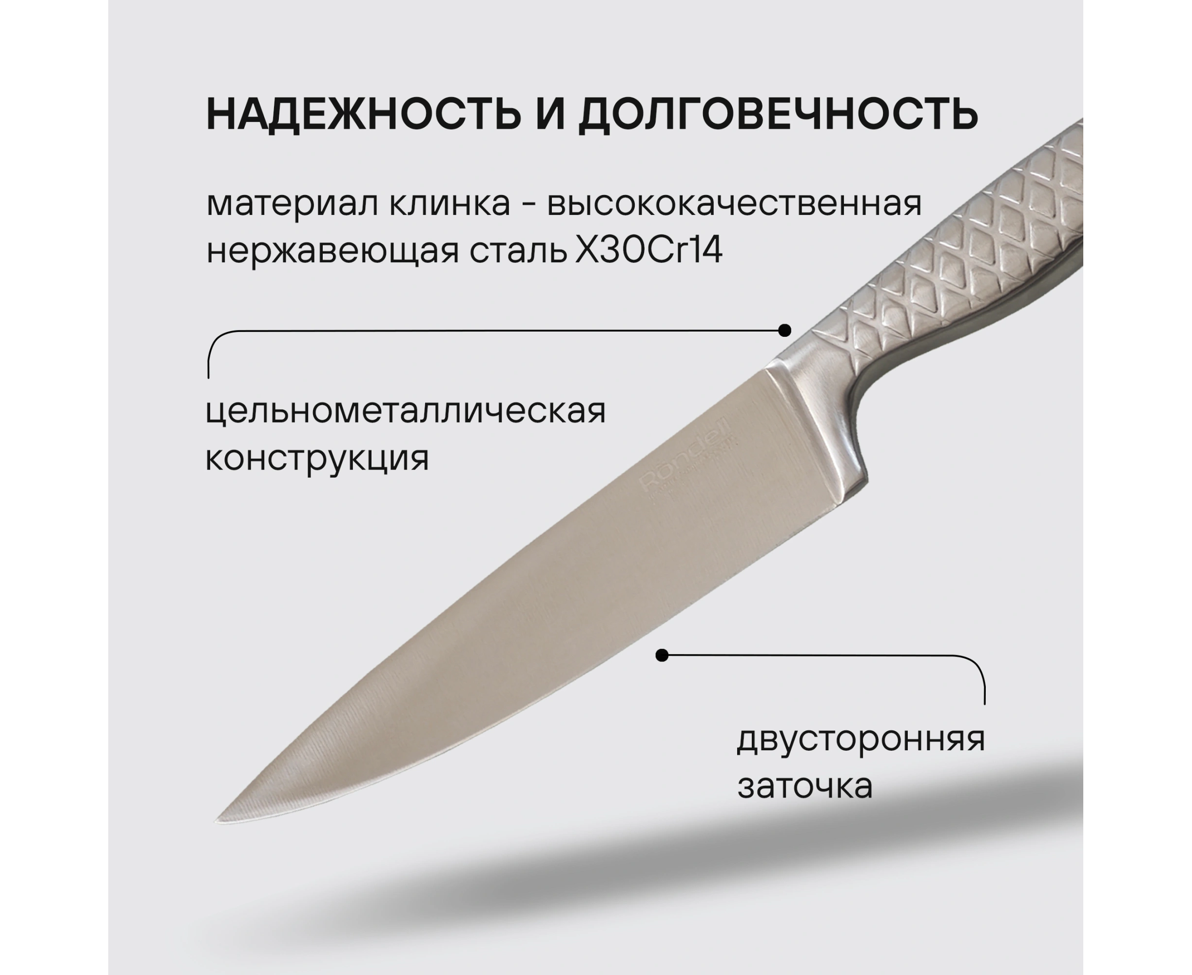 Материал клинка: высококачественная нержавеющая сталь X30Cr13. Особенности клинка: твердость по шкале Роквелла 52-55 HRC, двусторонняя заточка лезвий. Цельнометаллическая конструкция ножа. Противоскользящий рельеф на рукоятке. Материал клинка: высококачественная нержавеющая сталь X30Cr13.