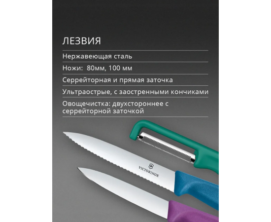 В комплекте 2 ножа фиолетового и синего цвета с прямой и серрейт заточкой, длиной лезвия 8 и 10 см, овощечистка Iota зеленого цвета c двойным лезвием и серрейт заточкой