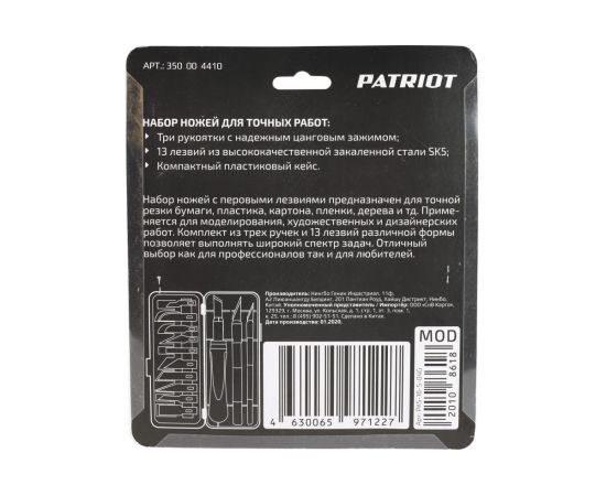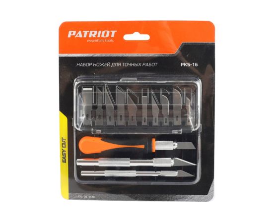Комплект ножей PATRIOT PKS-16 со сменяемыми лезвиями для резки тонких материалов. В комплекте идёт 13 стальных полотен разной формы и три рукояти разной толщины.