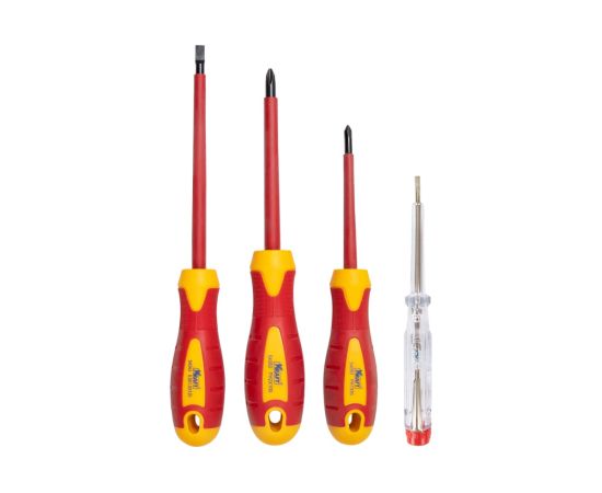 В набор отверток для электрика входят отвертки с прямым и крестовым шлицем. Удобный комплект, включающий необходимые инструменты для электрика. Состав: Индикаторная отвертка, Отвертка шлицевая SL 5.5x1.0x125, Отвертка крестовая PH1 X 80, Отвертка крестовая PH2 X 100. Хромванадиевая сталь (Cr-V), рукоятка из двухкомпонентного масло-бензостойкого пластика, диэлектрическое покрытие, которое выдерживает напряжение до 1000В.