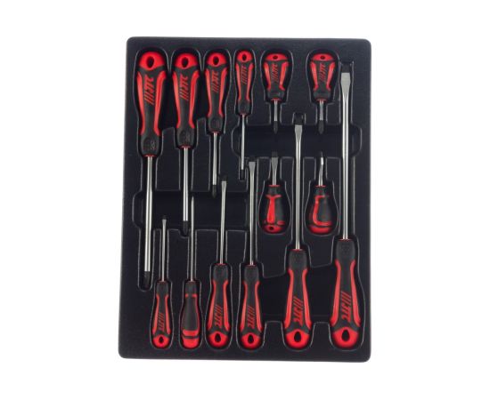 Набор отверток 14 предметов— комплект ручных инструментов для обслуживания крепежа с плоским и крестовым профилем. В набор включены отвертки разных размеров, поэтому с его помощью можно выполнять широкий спектр работ. Каждое изделие удобно располагается в отдельной ячейке ложемента.