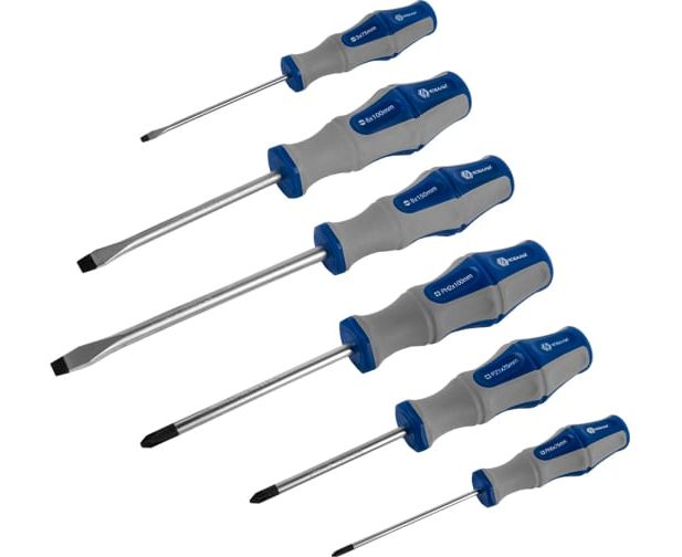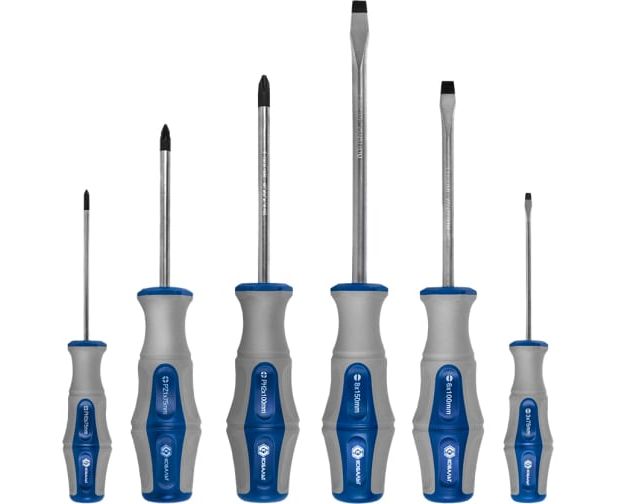 Набор отверток предназначен для отвинчивания/завинчивания резьбовых соединений. Рабочие части комплекта выполнены из хром-ванадиевой стали и имеют магнитные наконечники, которые примагничивают крепеж во время работы. Для прочности инструменты подвергаются термической обработке до твердости 51 - 54 HRC.