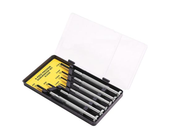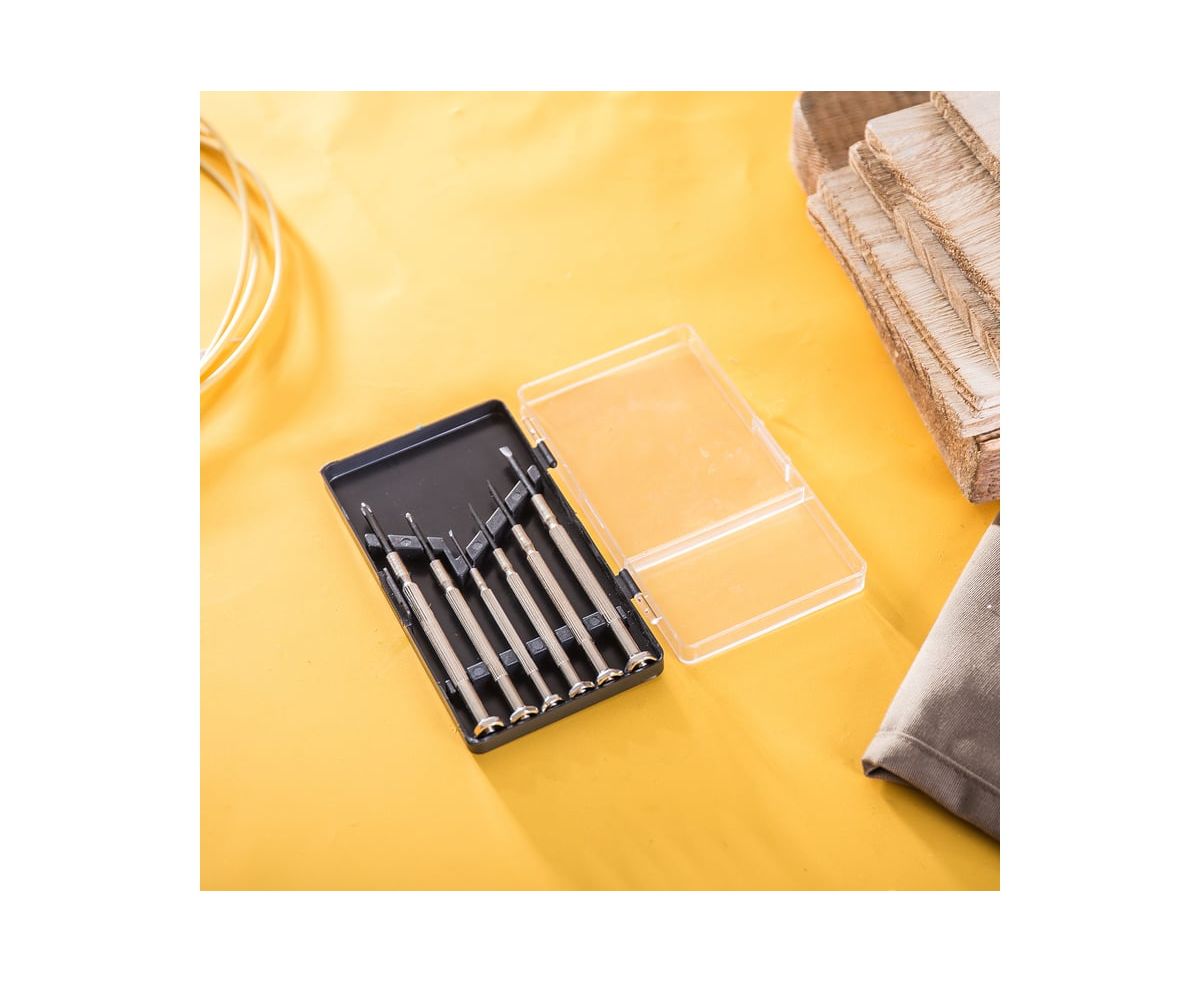 Набор прецизионных отверток DELI DL3206 6 шт. подходит для ремонта и обслуживания игрушек, часов, очков, инструментов, бытовой техники и различного прецизионного оборудования. Наконечник с антикоррозийным чёрным покрытием обеспечивает высокий контроль при работе отвертками. Вращающийся колпачок облегчает вращение крепежа. Никелированная ручка обладает антикоррозийной стойкостью и долговечностью. Отвертки изготовлены из углеродистой стали, что обеспечивает высокую прочность и надежность.