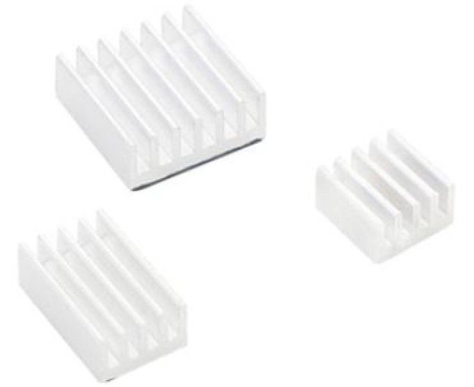 Особенности: Комплект из трех алюминиевых радиаторов для охлаждения микросхем одноплатного микрокомпьютера. 15x10x5мм, 14x14x6мм и 8.8x8.8x5мм