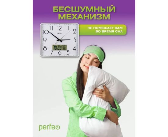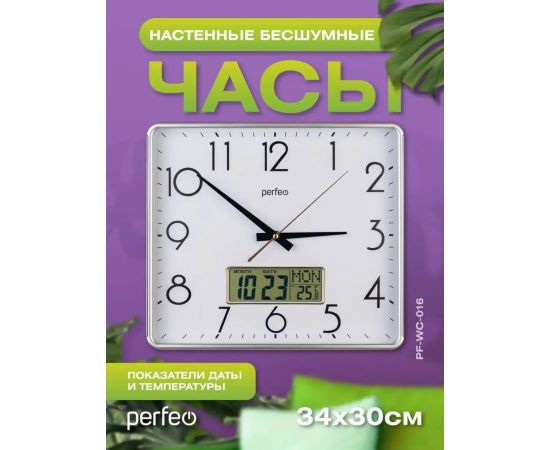 Настенные часы Perfeo "PF-WC-016", прямоугольные 34*30 см, серебряный корпус / белый циферблат