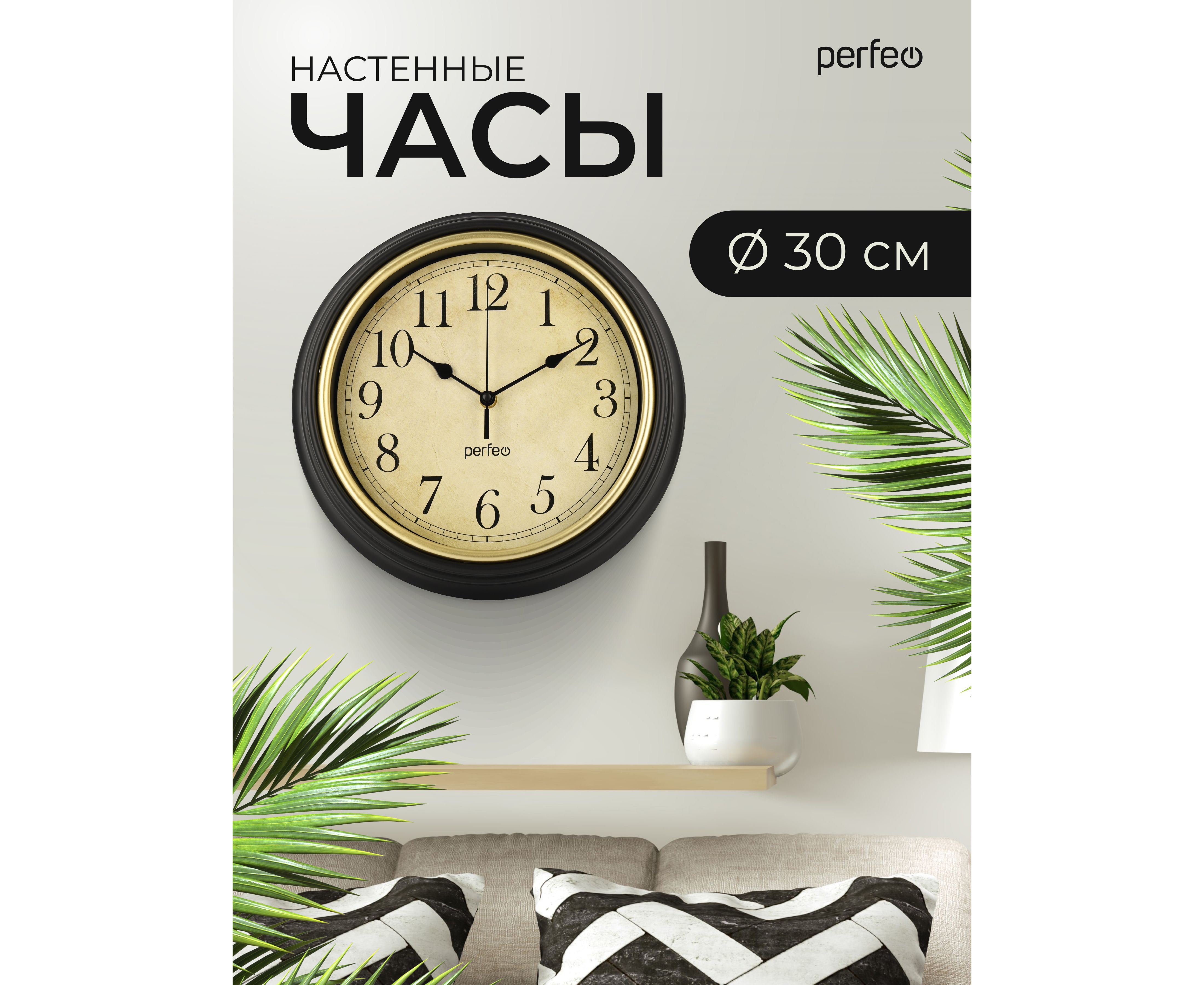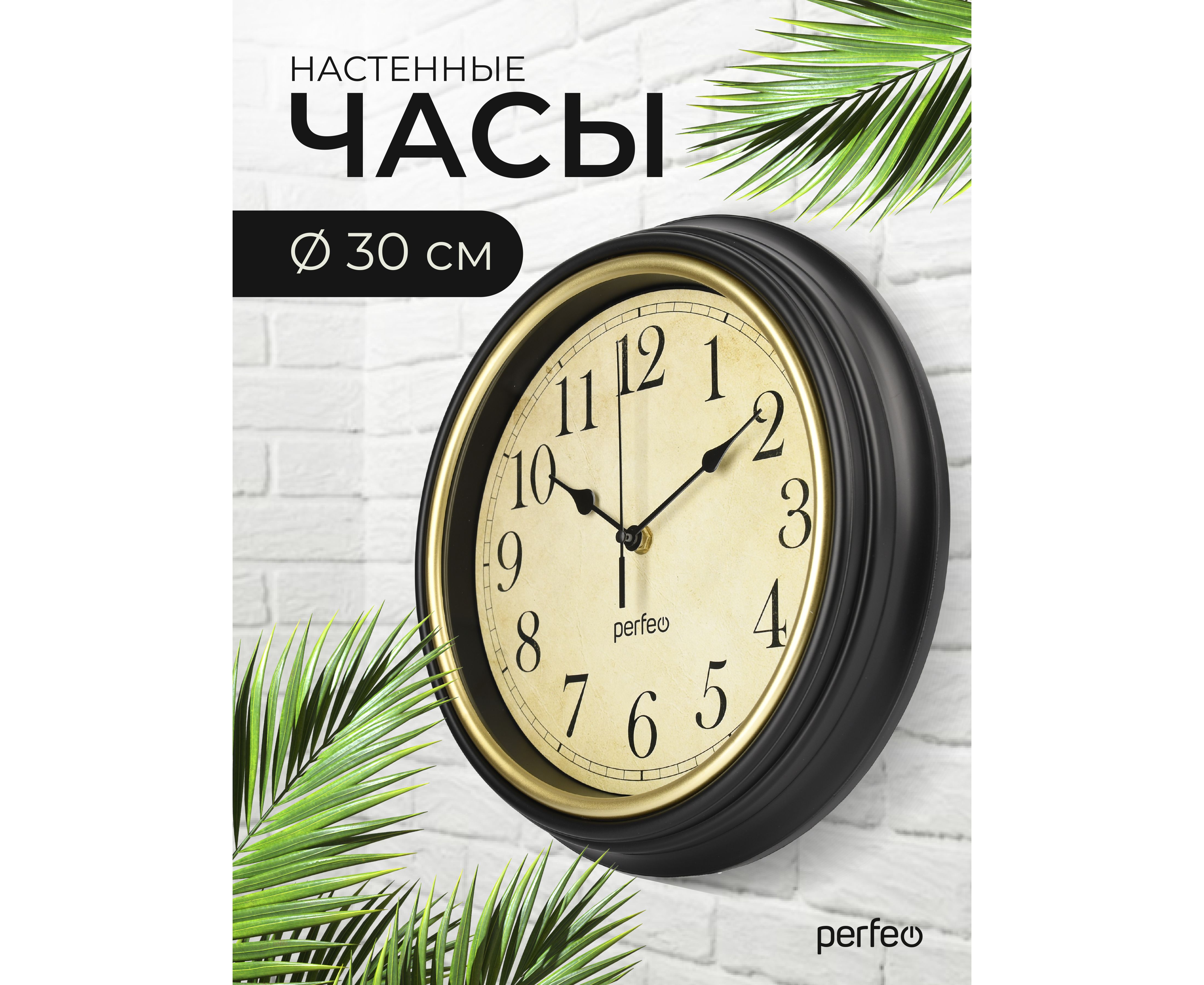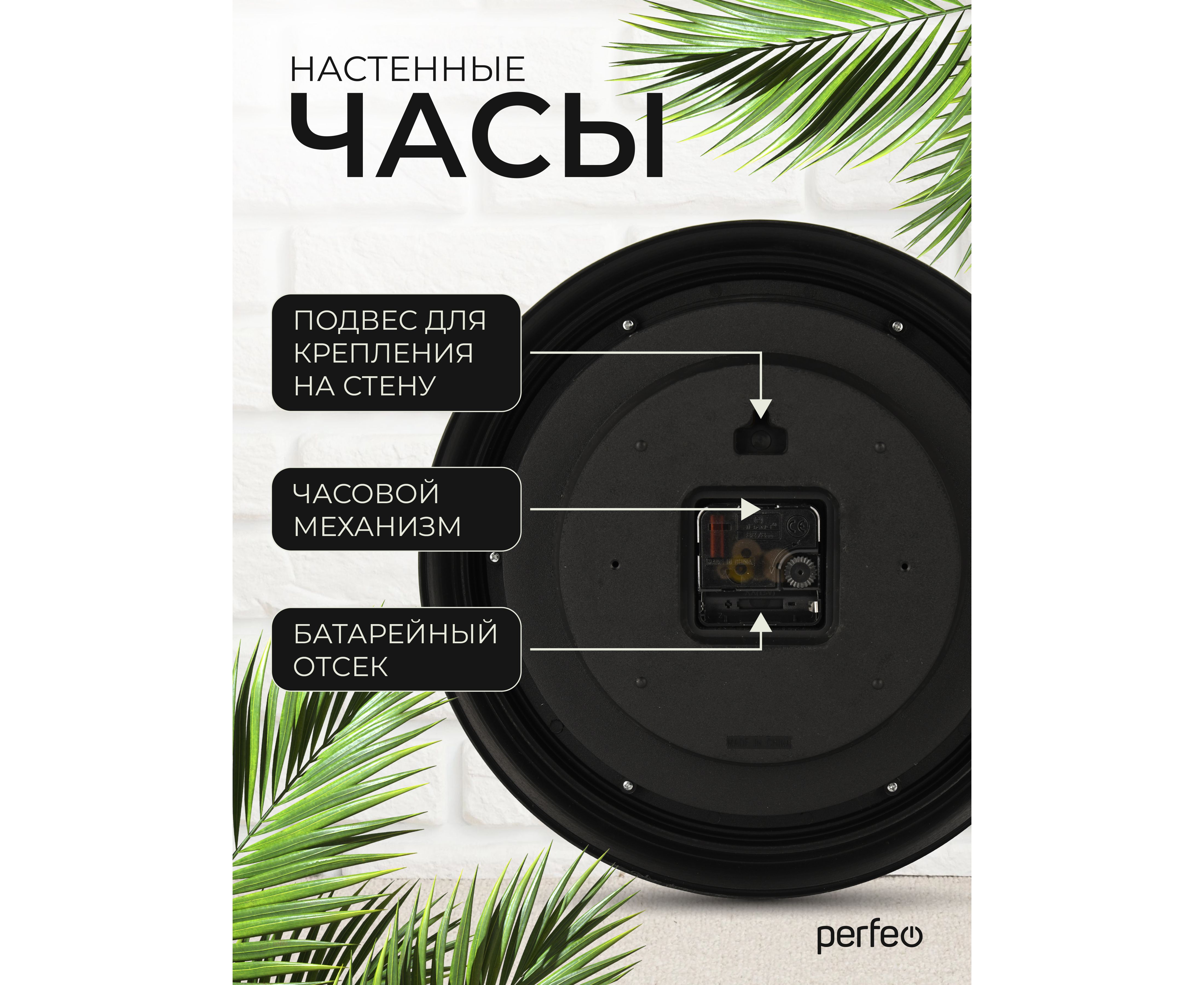 Настенные часы Perfeo "PF-WC-022"(С1) круглые д. 30 см, коричневый корпус / бежевый циферблат
