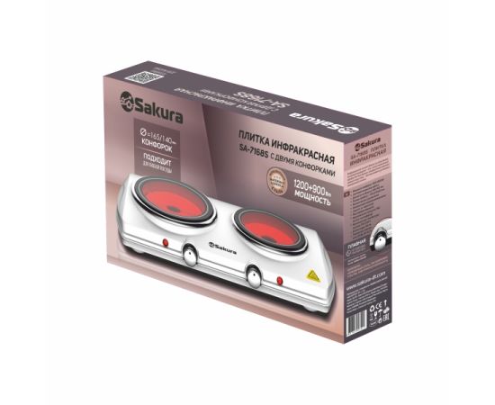 Дополнительные характеристики: размер прибора - 475*275*83мм, максимальная температура нагрева 530-570С, максимальная нагрузка на плиту 16кг (по 8кг на конфорку), световой индикатор