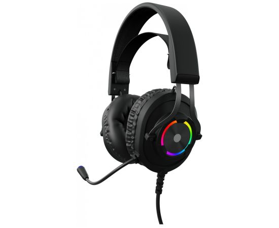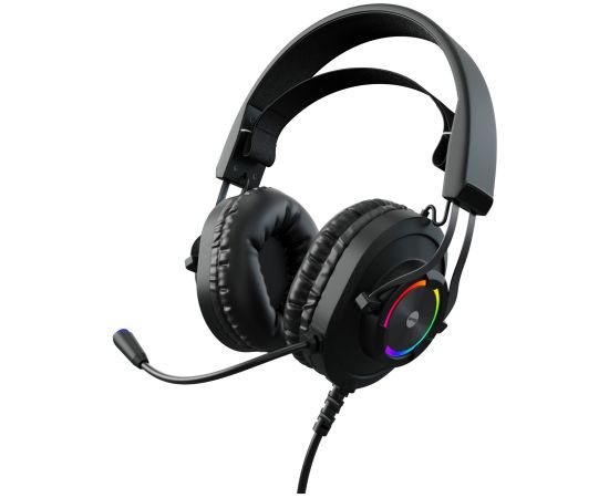 RGB подсветка; управление звуком и подсветкой на проводе; адаптивное оголовье; материал амбушюров - искусственная кожа