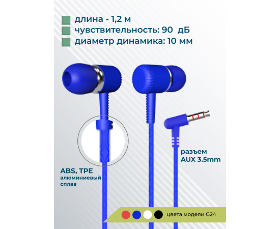 Наушники вакуумные AUX разъём с МК без рег.громкости длина 1.1м More choice G24 (Blue)