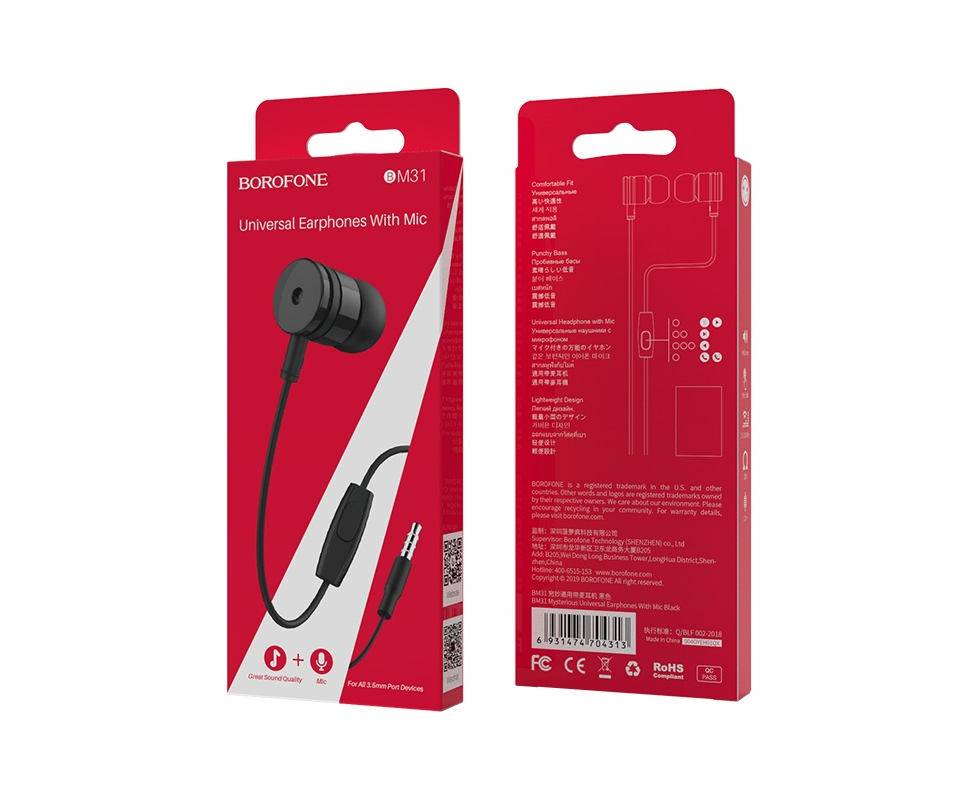 Наушники вакуумные AUX разъём с МК без рег.громкости длина 1.2м Borofone BM31 (White)