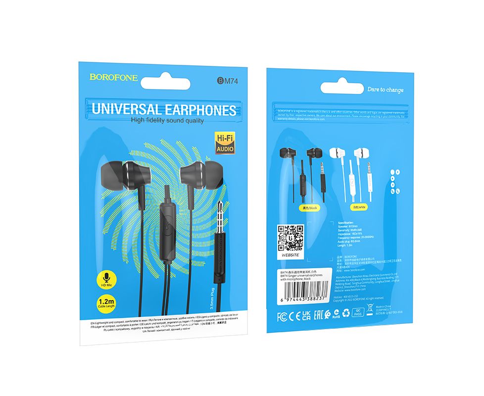 Borofone BM74 - это универсальные наушники с микрофоном, аудио штекером 3.5мм и кабелем длиной 1.2м. Вакуумные наушники с отличным звуком для прослушивания музыки в движении и микрофоном с пультом для комфортного общения. Чрезвычайно легкие и удобные в использовании. Прекрасные шумоизоляционные и звуковые данные, а также очень комфортная посадка в ухе, делают мобильную гарнитуру Borofone одной из самых удачных моделей наушников-вкладышей.