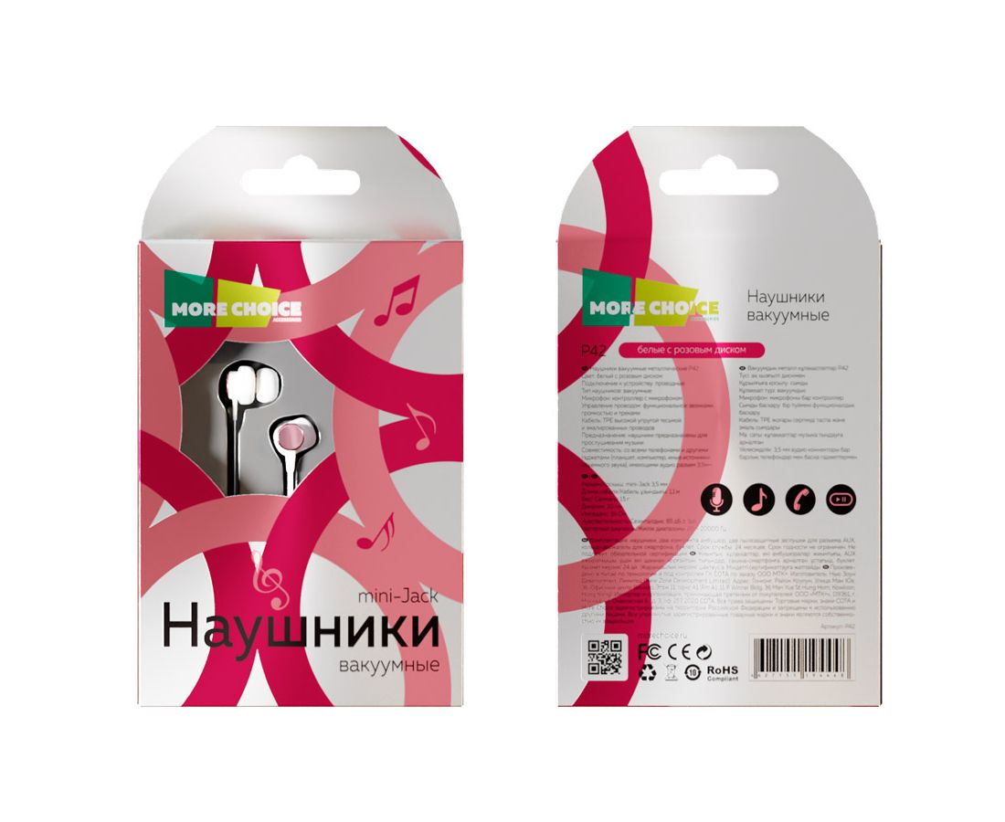 Наушники вакуумные AUX разъём с МК без рег.громкости длина 1.2м More choice P42 (White Pink)