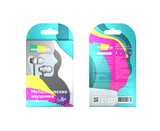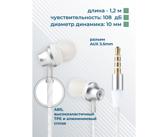 Наушники вакуумные AUX разъём с МК и рег.громкости длина 1.2м More Choice P61 (White Silver)