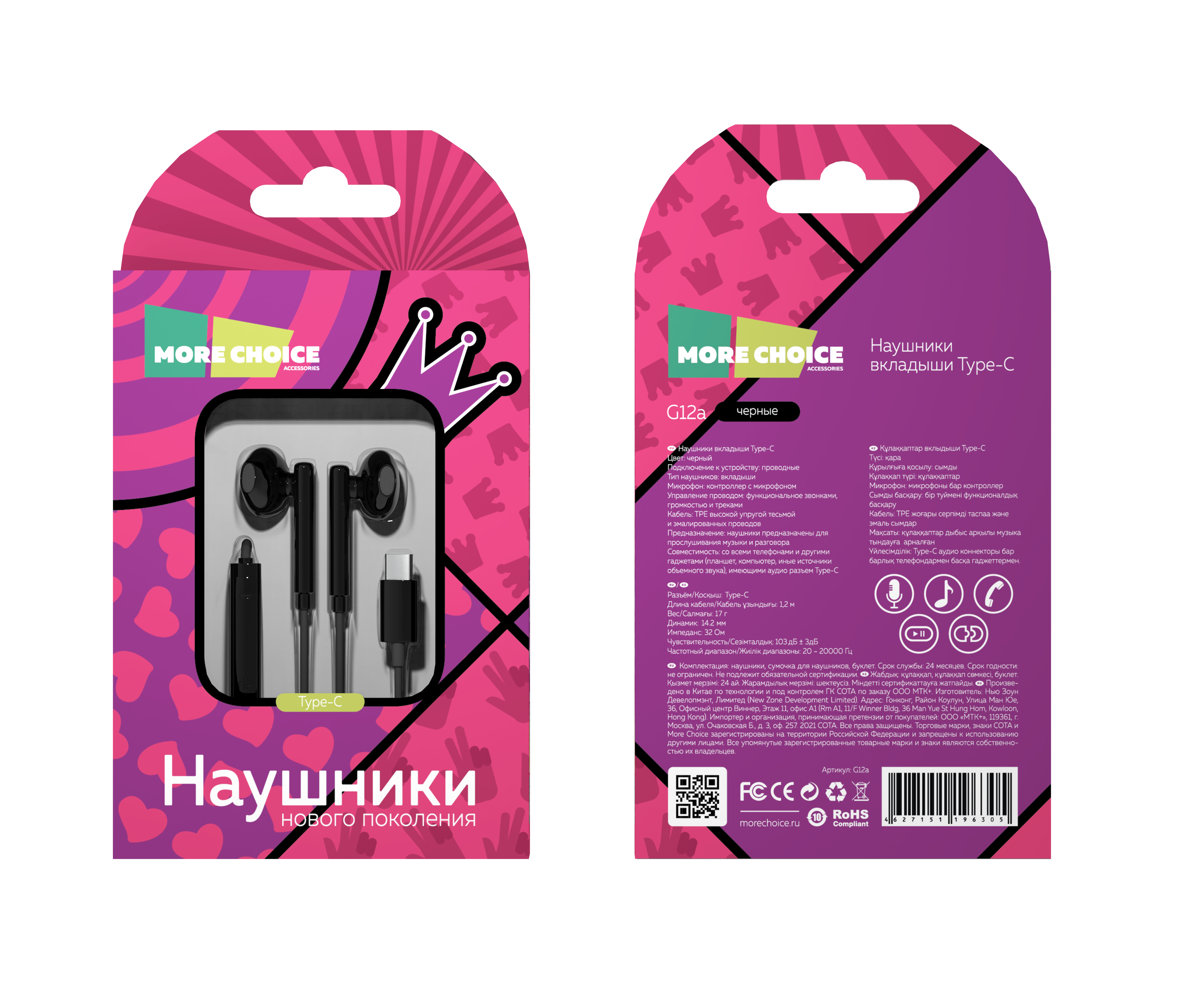 Наушники вкладыши Type-C разъём с МК и рег. громкости длина 1.2м More choice G12 (Black)