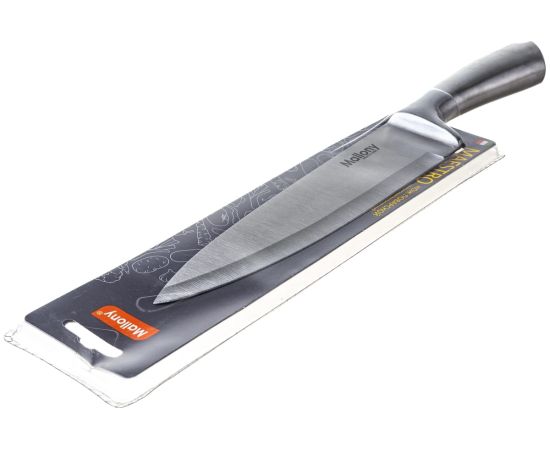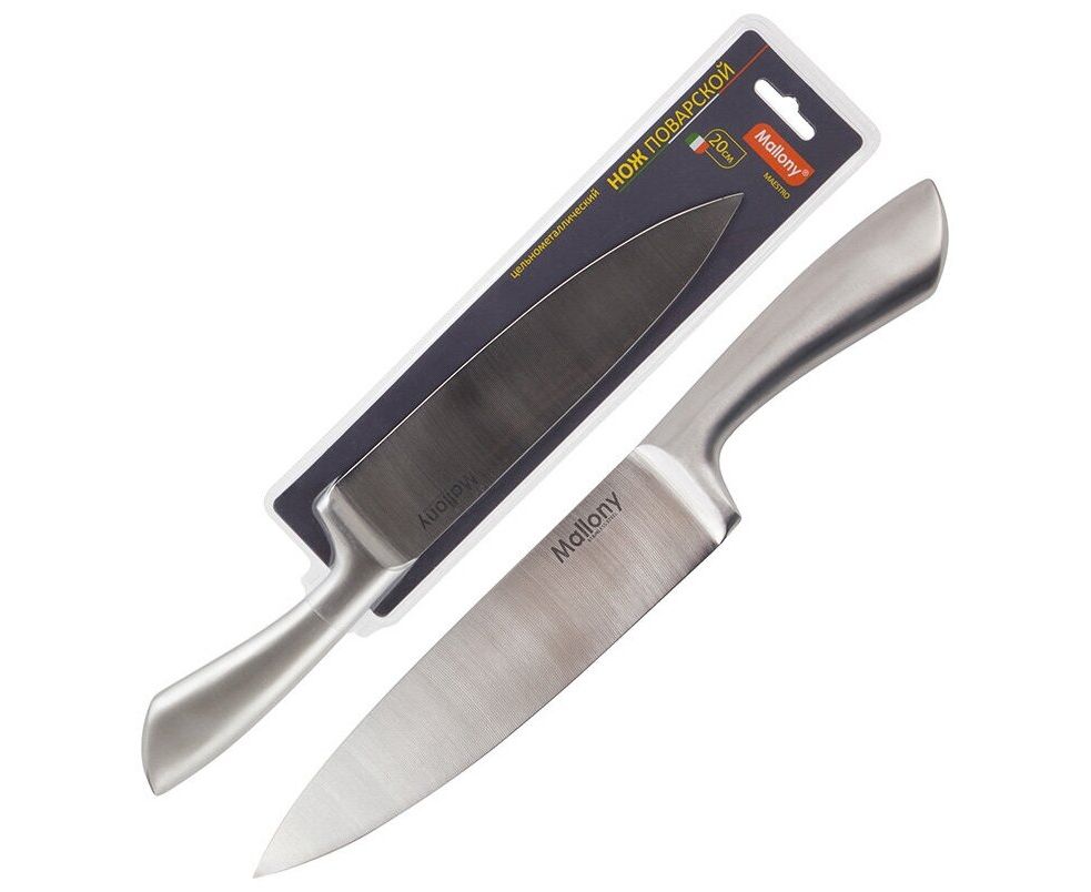 Цельнометаллический нож поварской, 20 см, изготовлен из прочной стали. Толщина клинка составляет 2 мм.