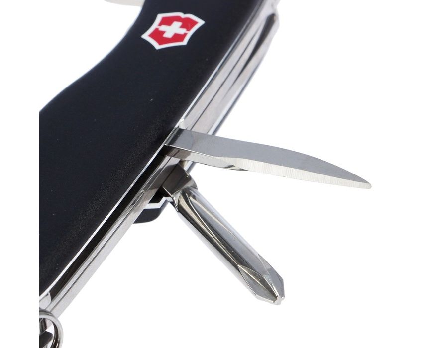 Список функций консервный нож с малой отверткой, шило, кернер, пила по дереву, крестовая отвертка, кольцо для ключей, зубочистка, пинцет, большое фиксирующееся лезвие с петлей для открывания одной рукой, открывалка для бутылок с отверткой -инструментом для снятия изоляции