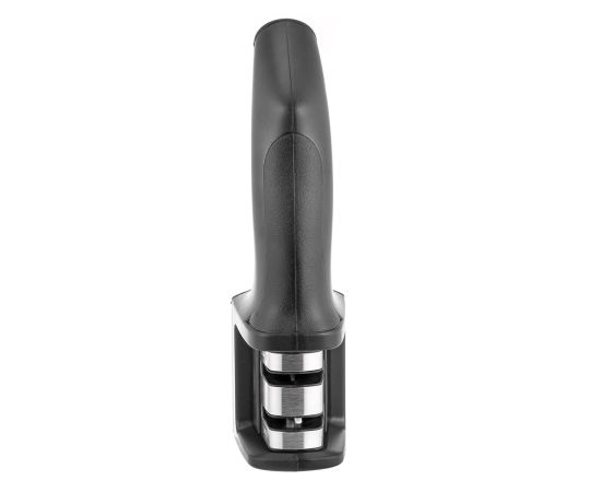 Анатомическая форма пластиковой рукоятки черного цвета подходит для правой и левой руки. Съемный блок с двумя точильными полотнами для удобного очищения корпуса от сложных загрязнений.