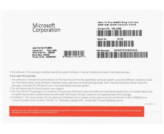 Операционная система Microsoft Windows 11 Pro (FQC-10528) 64Bit Eng Intl 1pk DSP OEI DVD