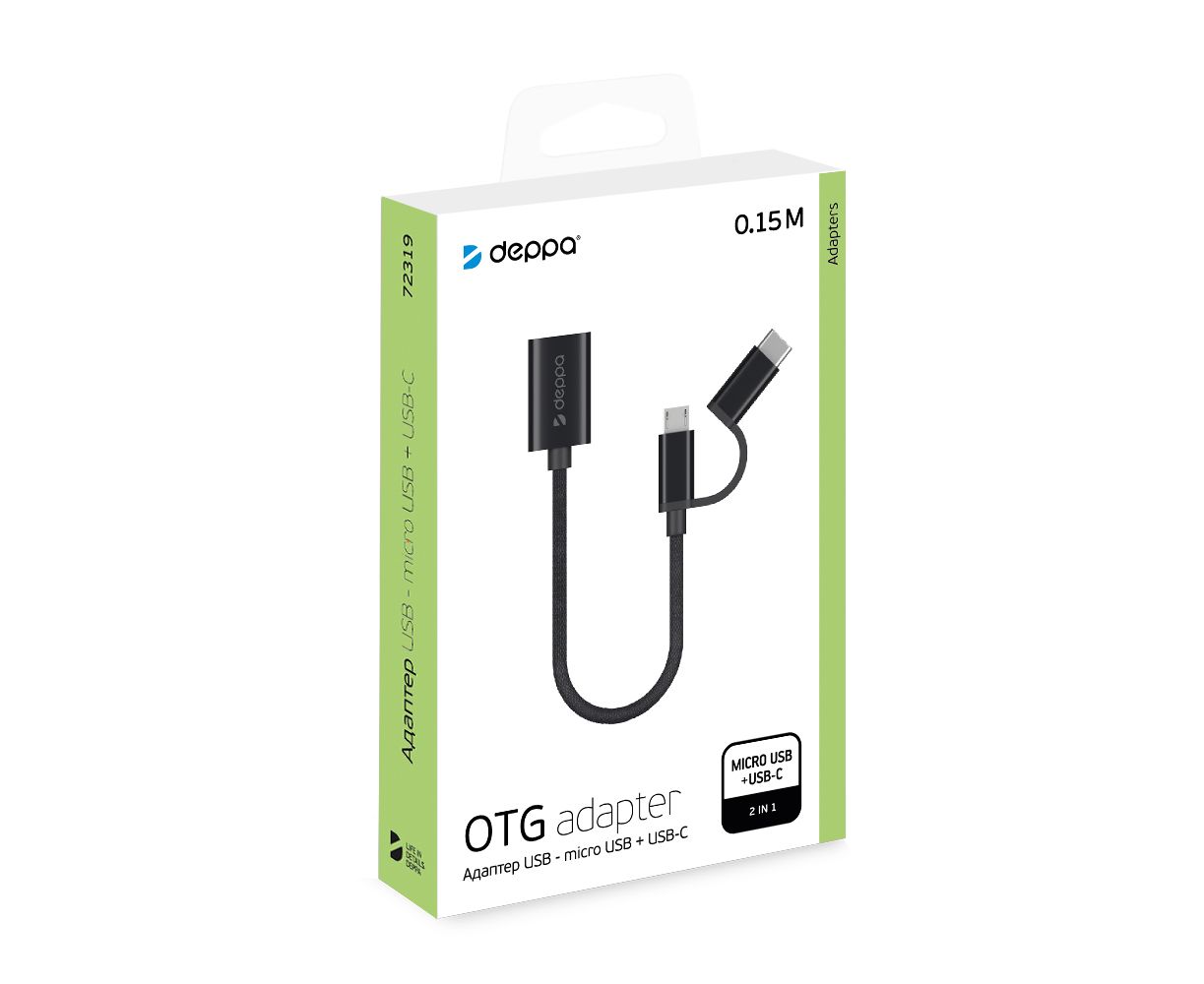 OTG адаптер USB - micro USB + USB-C, алюминий, нейлон, 0.15 м, черный, DEPPA, 72319