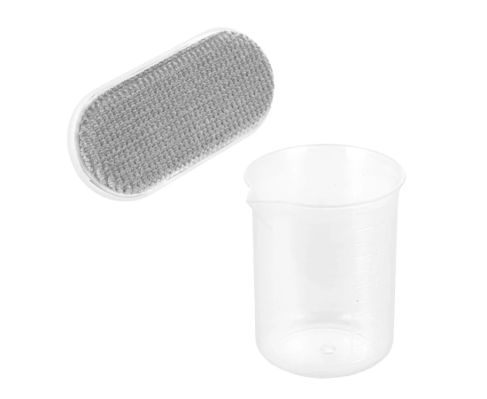В комплекте к прибору идёт щётка для чистки одежды, которой легко очищать текстиль от шерсти, ворса и волос. Помимо щётки с отпаривателем в комплекте идёт мерный стаканчик для удобного залива воды внутрь.