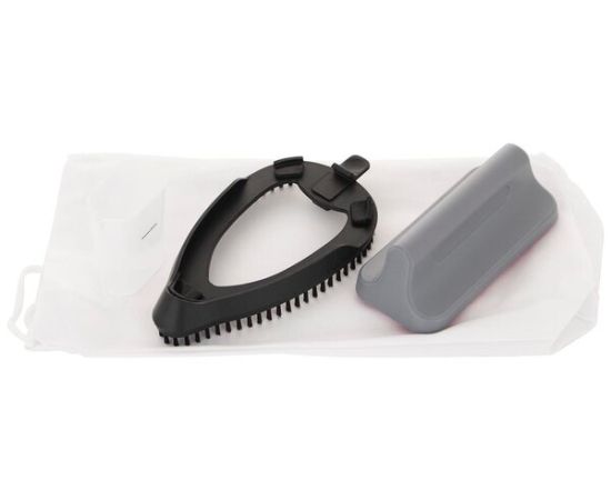 В комплекте с 4 аксессуара: тканевая щетка, разглаживающая ткань для лучшего распределения пара, ворсистая подушка для удаления волос, ворса и шерсти животных, мерный стакан для долива воды, дорожная сумка.
