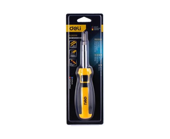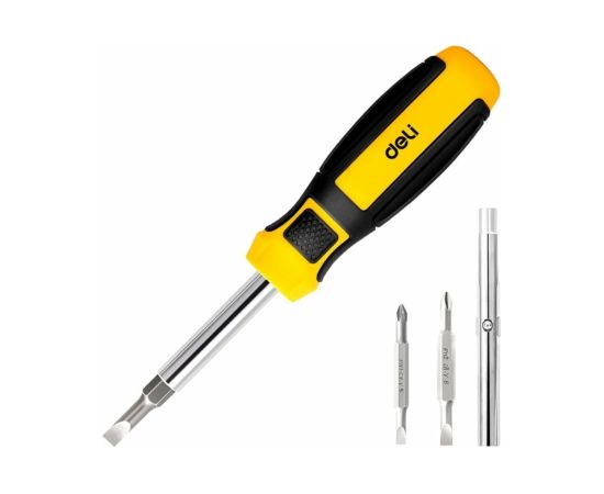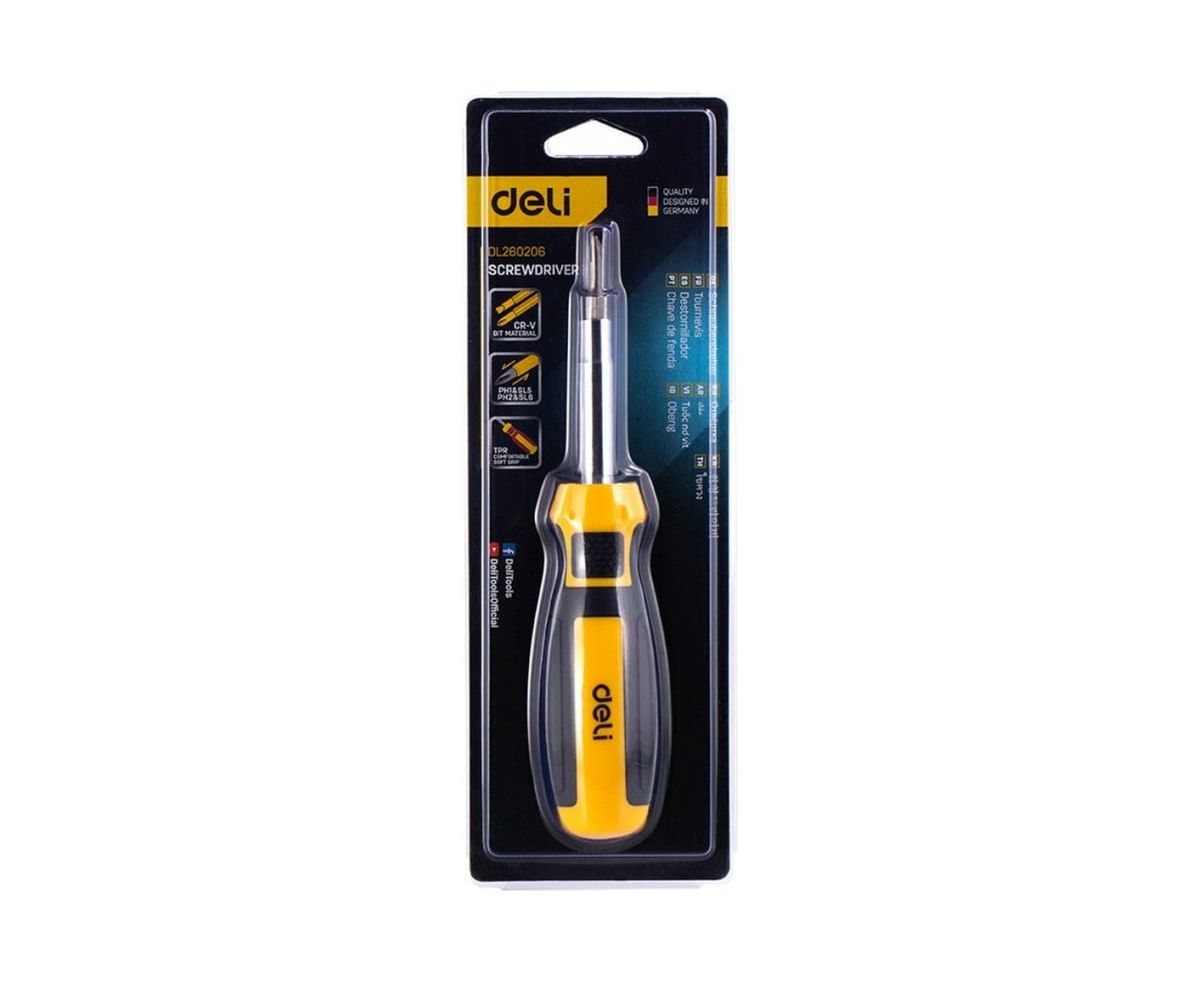 Многофункциональная отвертка DELI 6-в-1 dl260206 104516 используется для работ с резьбовыми соединениями в процессе ремонта или монтажа. Модель имеет две двусторонних насадки с двумя типами шлица. Стержни выполнены из качественной хромованадиевой стали, что обеспечивает высокую антикоррозийную стойкость и долговечность. Эргономичная рукоятка выполнена с учетом анатомических особенностей ладони, не скользит в руках и гарантирует продолжительную комфортную работу.