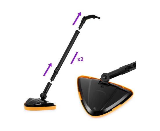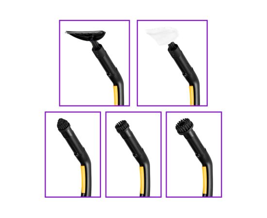 Длинная и удобная напольная щётка Удлинительная трубка надевается на паровой пистолет, а с другой стороны к ней присоединяется щётка для пола. Для увеличения длины в комплекте есть вторая трубка. Тряпка для пола крепится к щётке на липучке. Также в комплекте есть рамка для пола. Скребок для стекла используется для чистки окон, зеркал и кафеля. Скребком с тряпкой можно отпаривать текстильные предметы. Малая, большая и коническая нейлоновые щётки используются для чистки, когда требуется механическое воздействие.