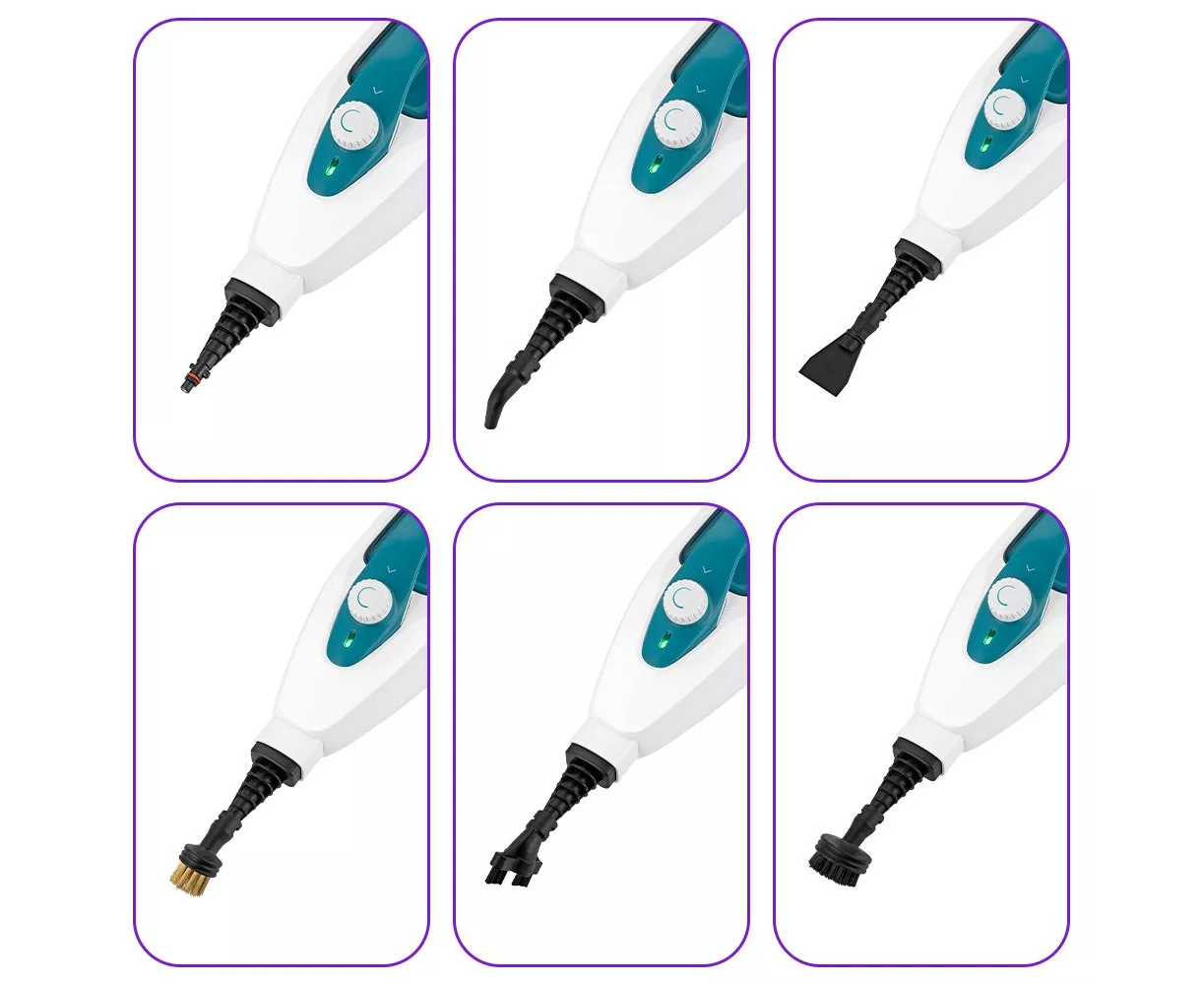 Конструкция «2 в 1» предусматривает ручной модуль, который удобно использовать с насадками. Скребок, латунная и нейлоновые щетки очищают сложные загрязнения с помощью механического воздействия, а струйная и угловая насадки помогут очистить щели и углы.