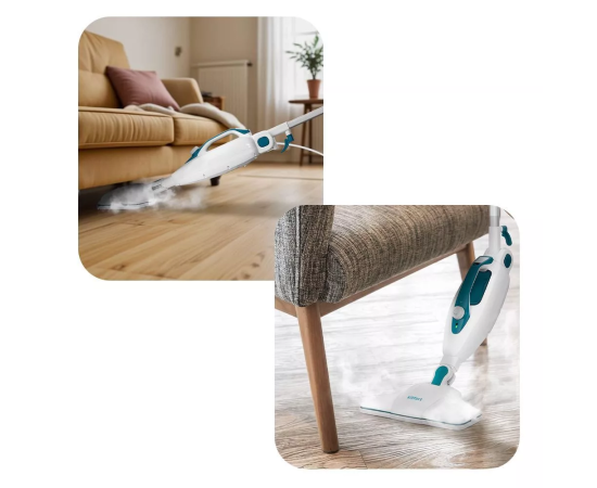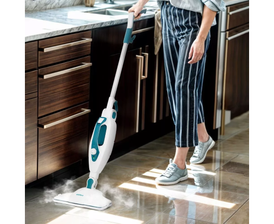 Паровая швабра обладает функцией вертикальной парковки и большим углом наклона при уборке, а также удлинительную ручку можно сложить, чтобы легко убирать пространство под мебелью.