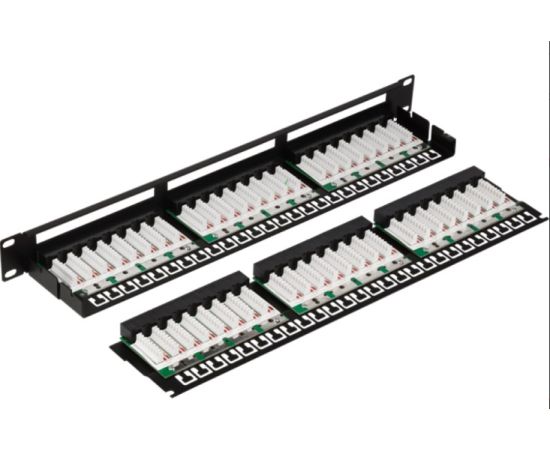 Патч-панель обеспечивает высокую плотность размещения портов RJ-45, а именно 48 портов на 1U. Площадка с верхним рядом портов съемная, чтобы было удобно работать с конструкцией в процессе монтажа.