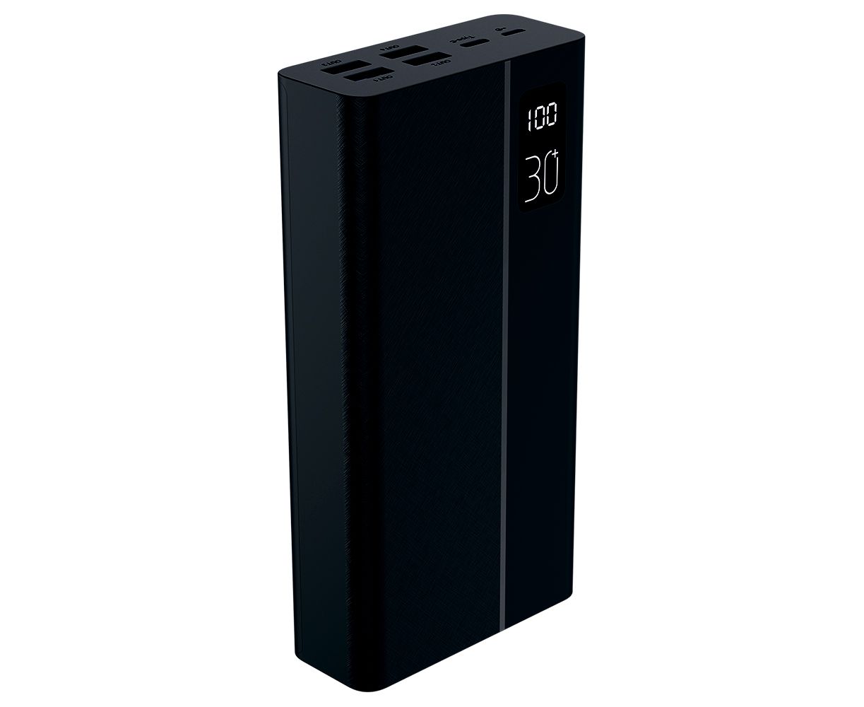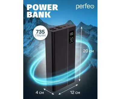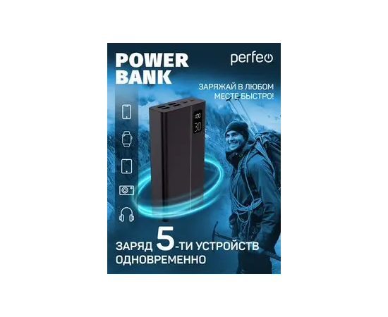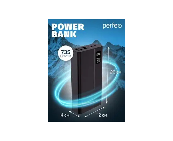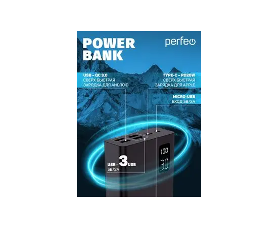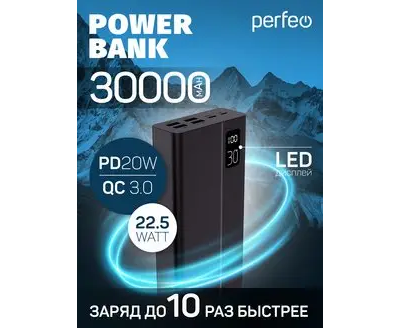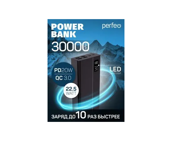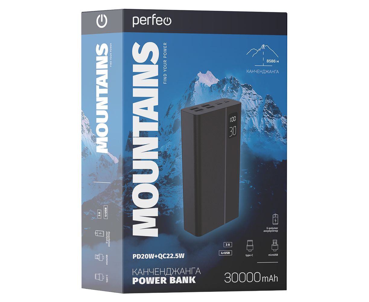 Пауэрбанк Perfeo MOUNTAINS 30000 mAh/LED дисплей/PD + QC 3.0/Type-C/4 USB/Выход: 3A, max 22.5W/ Черный, (Арт. PF_D0161)