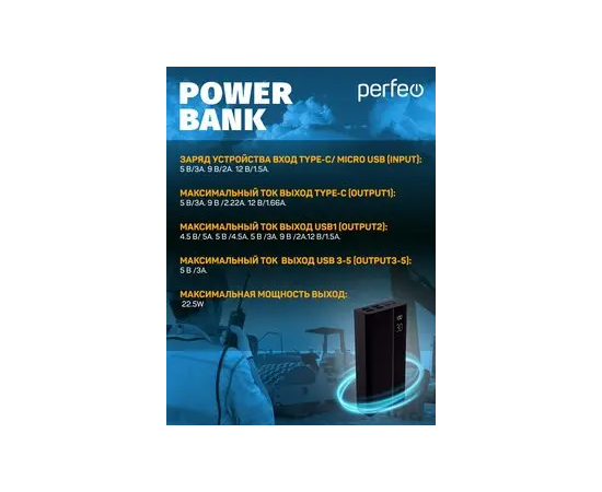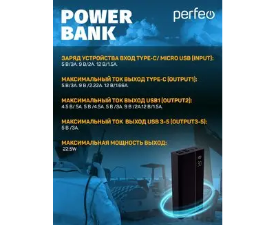 Представляем Вашему вниманию модельный ряд пауэр банков для экстремальных условий использования. Данные внешние аккумуляторы имеют большую емкость, и поддерживают быструю зарядка как самого себя так и устройство. Внешний аккумулятор Power Bank (повербанк, пауэр банк, портативная зарядка, портативное зарядное устройство) для различных устройств таких как смартфонов, телефонов, планшетов, часов, наушников. Ёмкость повербанка от 30000 до 50000 mAh. Power bank поддерживает технологию Quick Charge 3.0 и PD (20W) обеспечивает высокую скорость зарядки устройств. Устройство оснащено дисплеем с индикацией остаточной емкости. Пауэр Банк имеет 5 разъемов для одновременной зарядки устройств – 4 – USB, 1 - TYPE-C. Для зарядки самого устройства можно использовать входной разъем Micro-USB или Type-C. Power bank имеет встроенную защиту от короткого замыкания, перезарядки или от сильной разрядки, защиту по напряжению. Вход для зарядки внешнего аккумулятора (Micro/Type-c): DC5V/3A, 9V/2A, 12V/1.5A. Таким образом заряд самого пауэр банка будет намного быстрее, чем обычного. Выходные напряжения у Type -C: DC5V/3A, 9V/2.22A, 12V/1.66A. Выходные напряжения USB №1: DC4.5V/5A, 5V/4.5A, 5V/3A, 9V/2A, 12V/1.5A. Выходные напряжения USB №2, №3, №4: DC5V/3A(Max). Максимальная выходная мощность (суммарная): 22.5W(Max)
