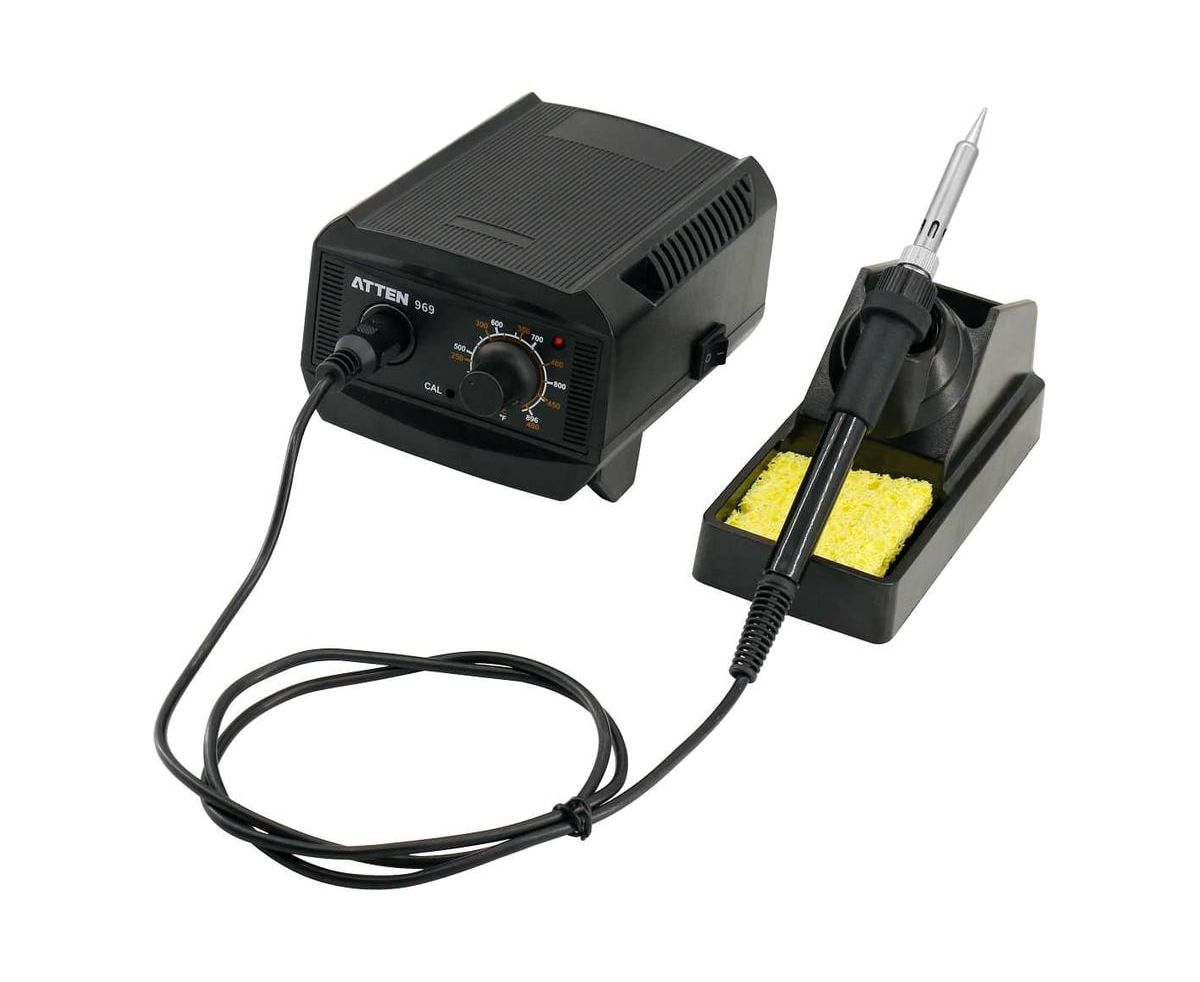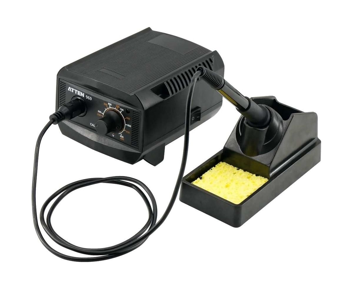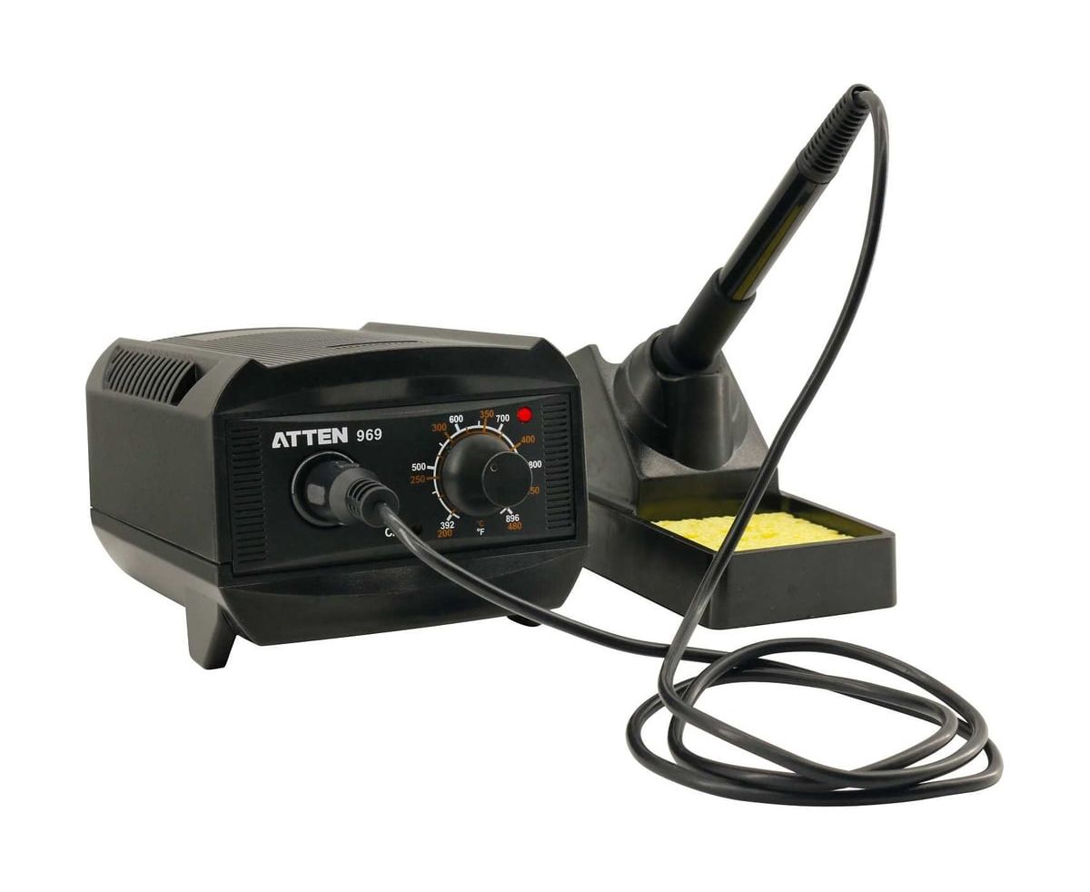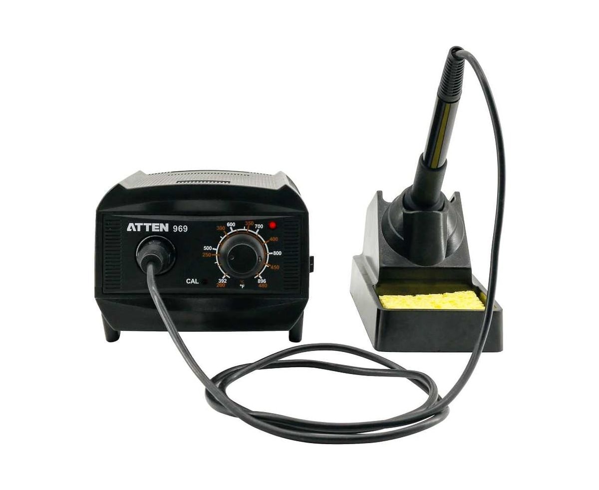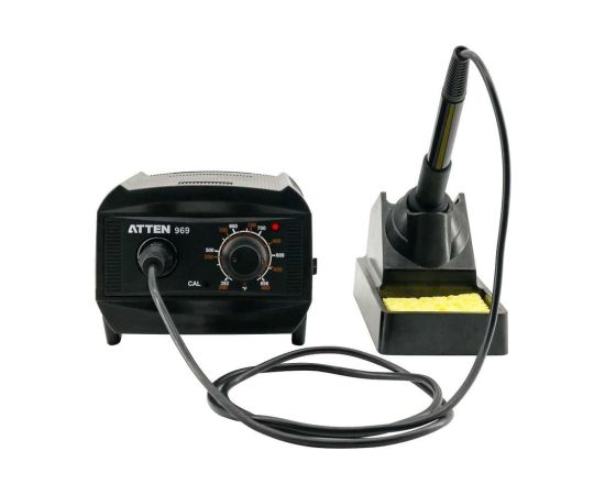 ATTEN ST-969 — цифровая паяльная станция начального уровня. Диапазон рабочих температур от 200 до 480°C. Станция поддерживает температурную поправку и точную калибровку обратной связи. Станция оснащена ручкой для предварительной настройки или переключения между часто используемыми температурами. Отдельная подставка для паяльника, входящая в комплект поставки, экономит пространство и упрощает работу с паяльником.