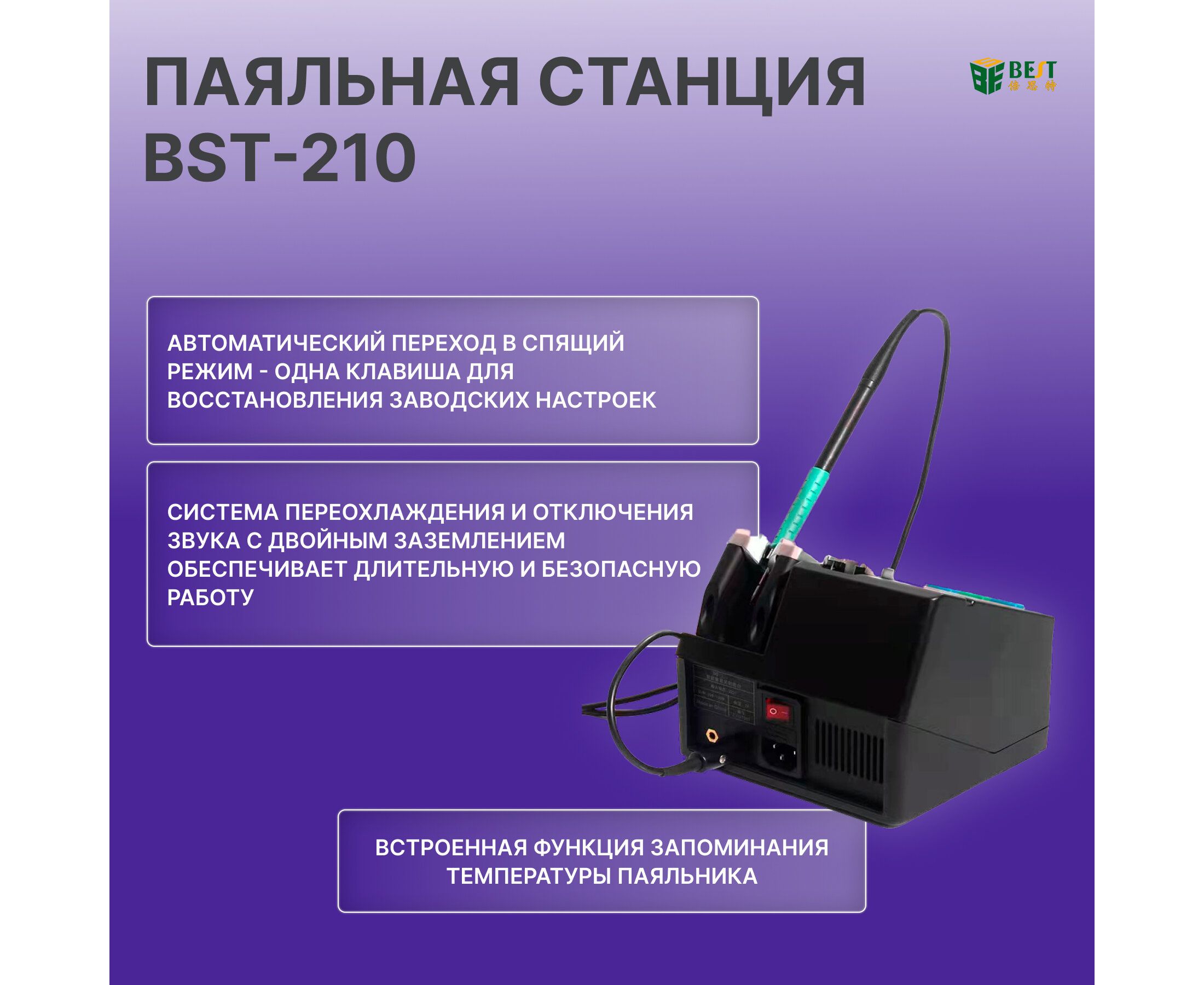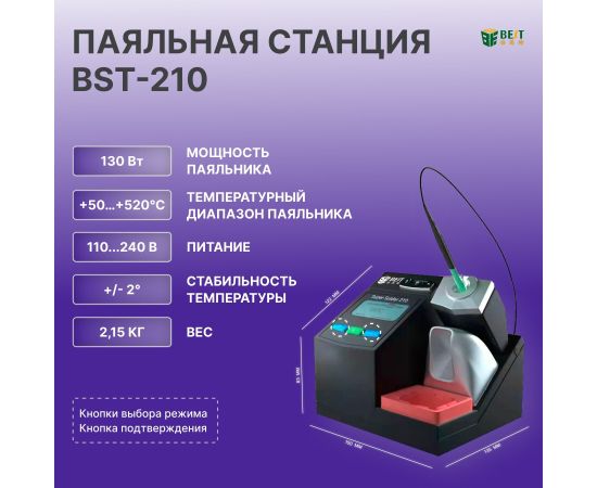 Интеллектуальный дизайн: BST-210 имеет интеллектуальный дизайн, который обеспечивает стабильную и стабильную работу, что делает его идеальным для деликатных электронных компонентов и точных работ.