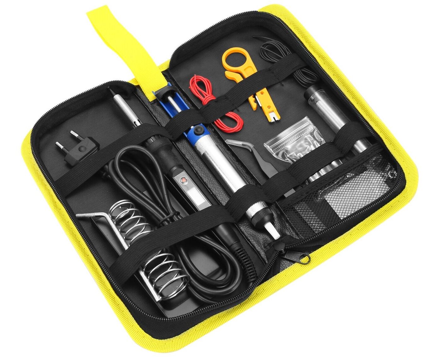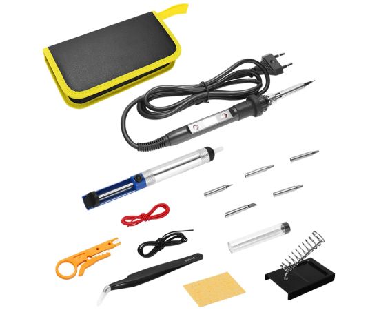 паяльник цифровой 80 Вт, 220 В (1 шт.), комплект наконечников: конус, игла, клин, скос, ножевидное (5 шт.), держатель для паяльника (1 шт.), губка для очистки паяльного жала (1 шт.), пинцет (1 шт.), оловоотсос (1 шт.), нож для снятия изоляции (1 шт.), припой (1 упак.), провод (2 шт.), пенал на молнии (1 шт.)