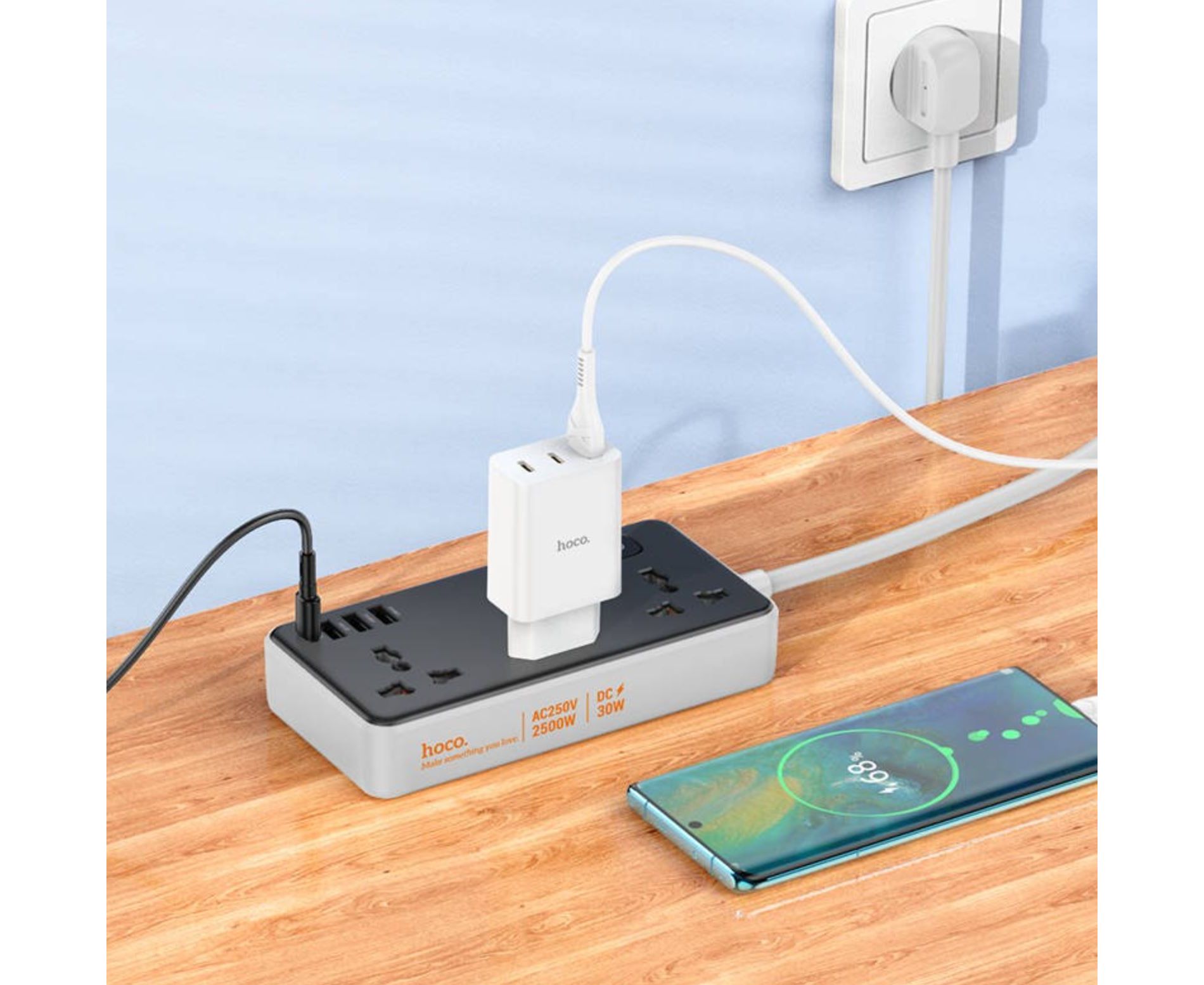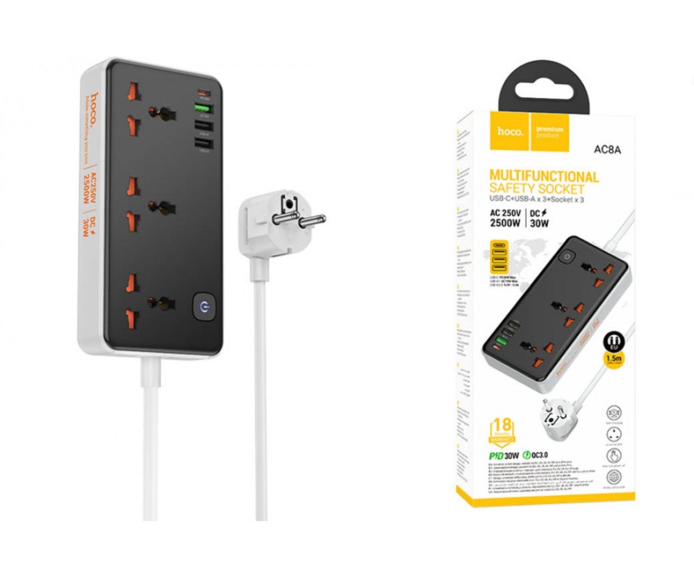 Переходник сетевой Hoco AC8A Storm 3-position socket (PD30W/1C3A) (EU) (черный)