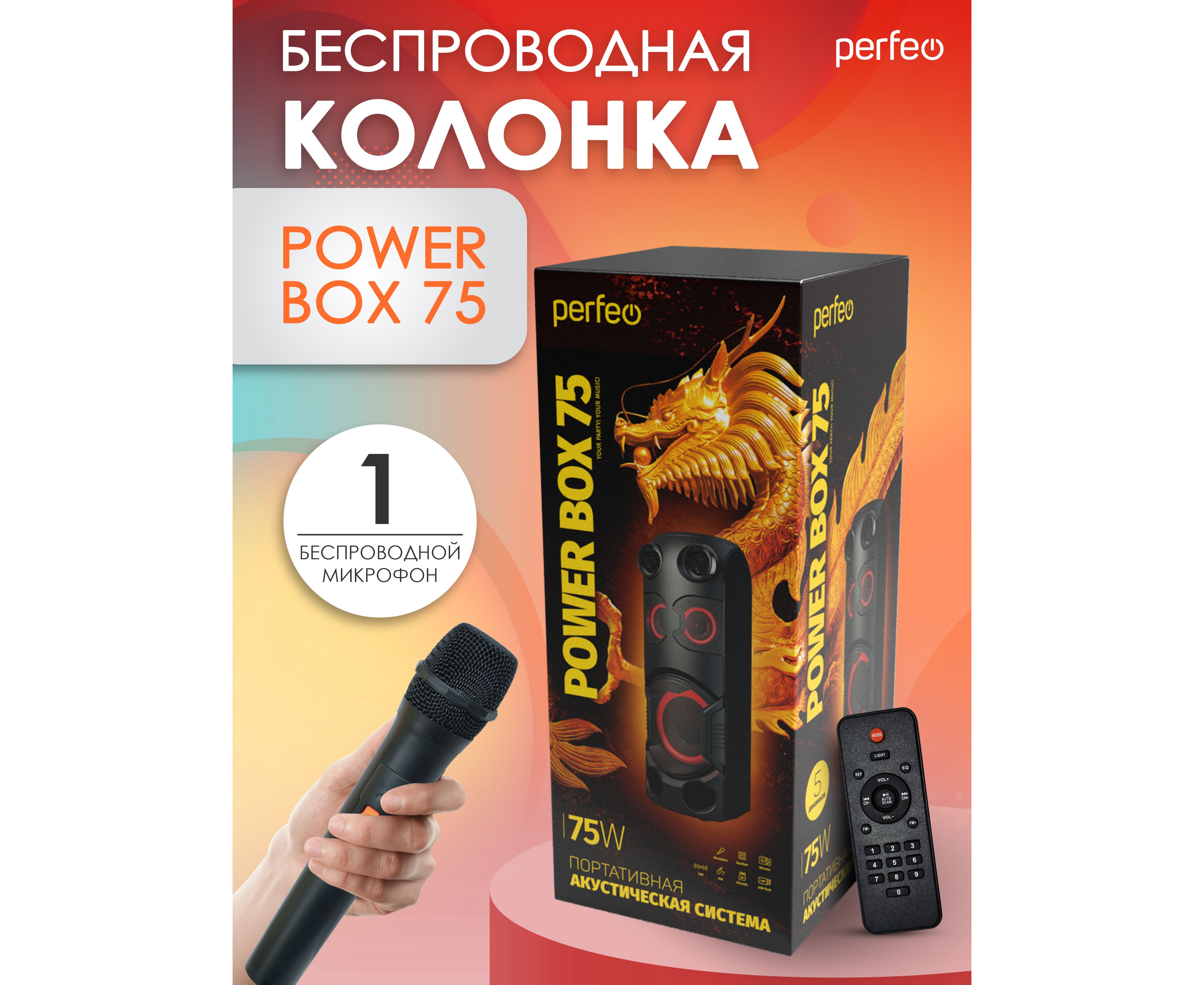 Беспроводная колонка Perfeo Power Box 75 - это громкая, мощная, беспроводная колонка с чистым звуком на 75 Вт в комплекте с эквалайзером, пультом ДУ и подсветкой. Портативная блютуз колонка универсальная, подходит для телефона, смартфона, планшета, ноутбука. Подключается посредством блютузом или кабелем через AUX разъем, а встроенный в беспроводную напольную колонку плеер воспроизводит micro sd и usb флешкой карты памяти. Радиоприемник с проигрыванием FM радиостанций для любителей использовать портативку как аудиосистема. В комплекте идет беспроводной микрофон! Также есть два входа для микрофона, чтобы исполнять караоке или подключать электро-гитару. Музыкальная колонка Power BOX 75 от Perfeo – это мощная, переносная станция с подсветкой и караоке для применения на даче, для дома, улице, или озвучивания спортзала, танцевальных занятий, йоги, фитнеса. Мобильная акустическая система со светомузыкой и эквалайзером позволит вам 8 часов наслаждаться чистым звуком и любимыми песнями. Мы указываем честное время проигрывания музыки. Это отличный подарок как для подростков и детей: мальчиков и девочек, так и для взрослых. Супер предложение для того чтобы стать центром шумной вечеринки. Динамическая RGB-подсветка, способная раскрасить ваше пространство. Режимы подсветки помогут адаптировать работу светомузыки под разные мелодии — от динамичных треков, до спокойной, размеренной мелодии. За качественное звучание отвечают ПЯТЬ динамиков. Портативная акустическая система — это не просто большая беспроводная колонка, а настоящий мобильный центр развлечений. Надежный инструмент для проведения шумных мероприятий, будь то свадьба, для праздников, дискотека или умиротворенная медитация. Отличный подарок на новый год! Для детских праздников. Для спортивных мероприятий. С портативностью и качеством звука, эта колонка гарантирует удобство использования. Ее дизайн и функциональность сделают любую вечеринку незабываемой.