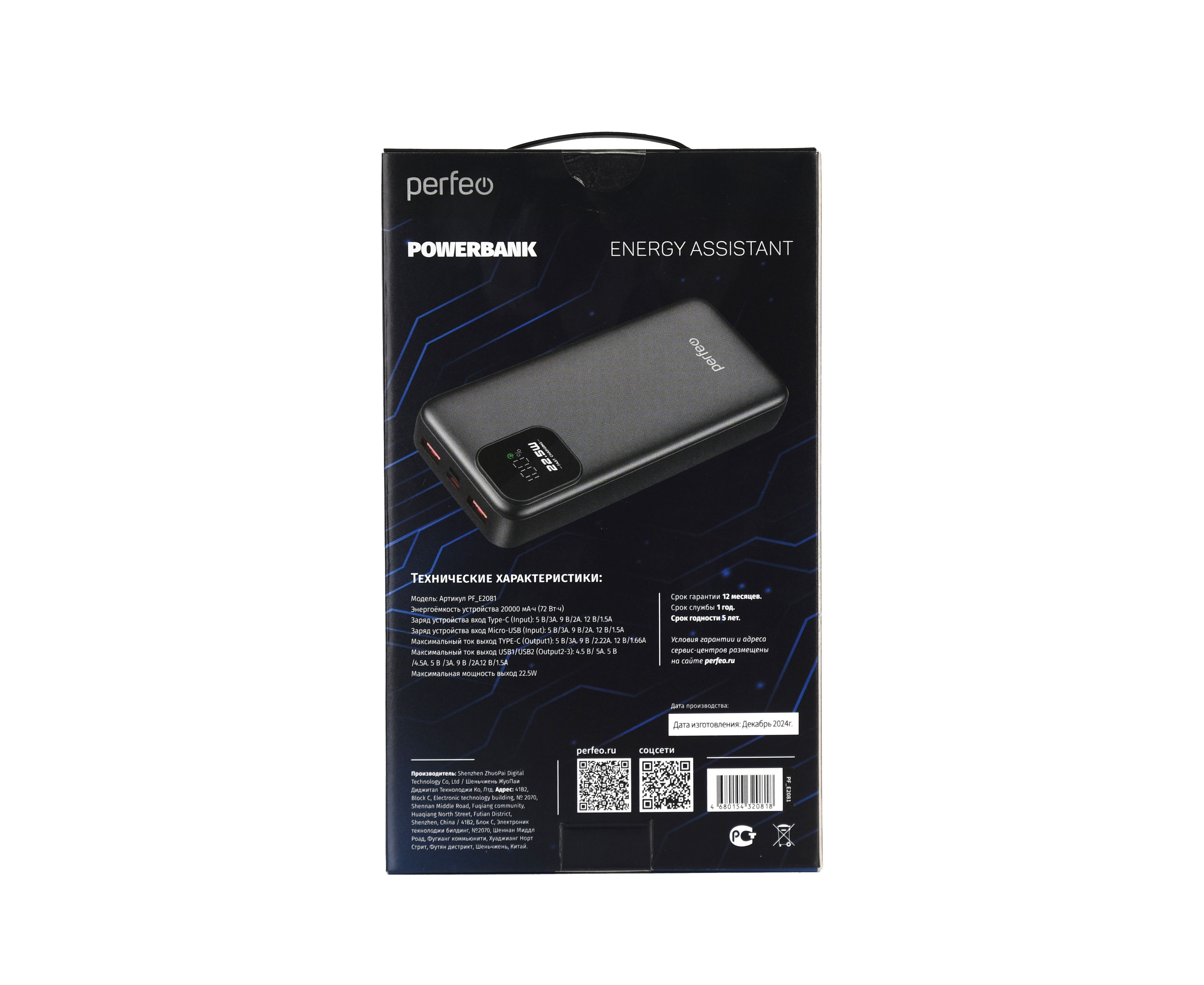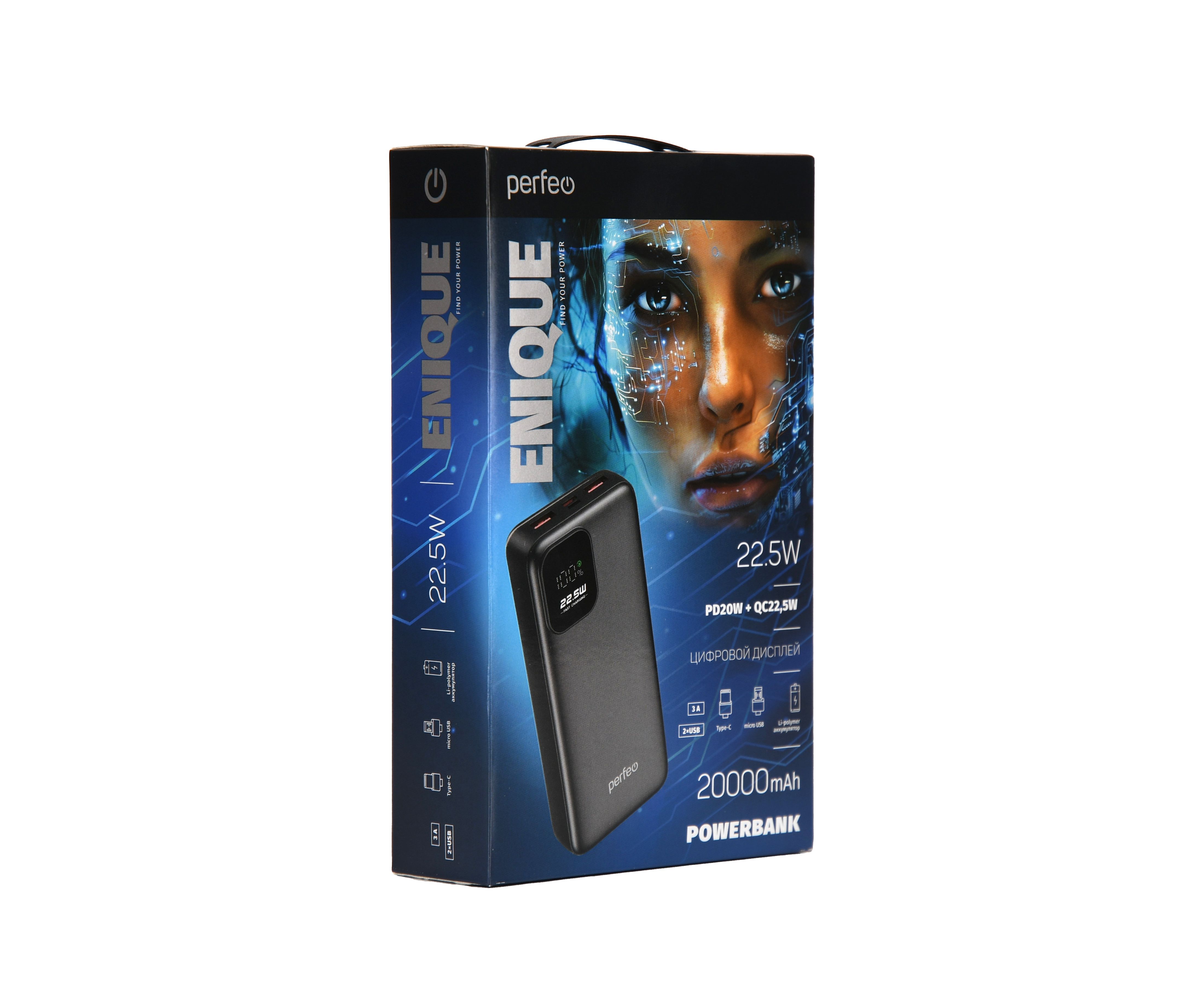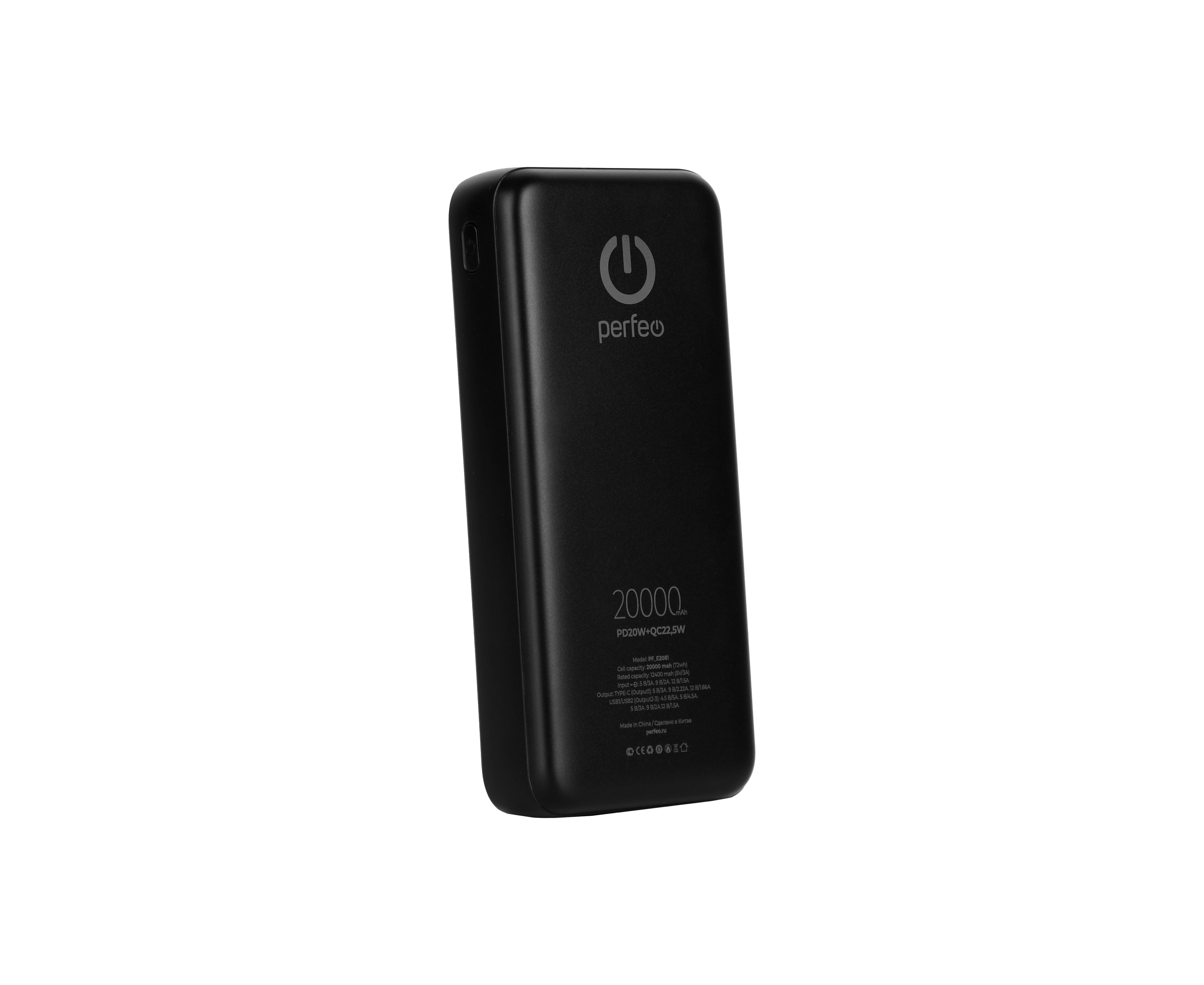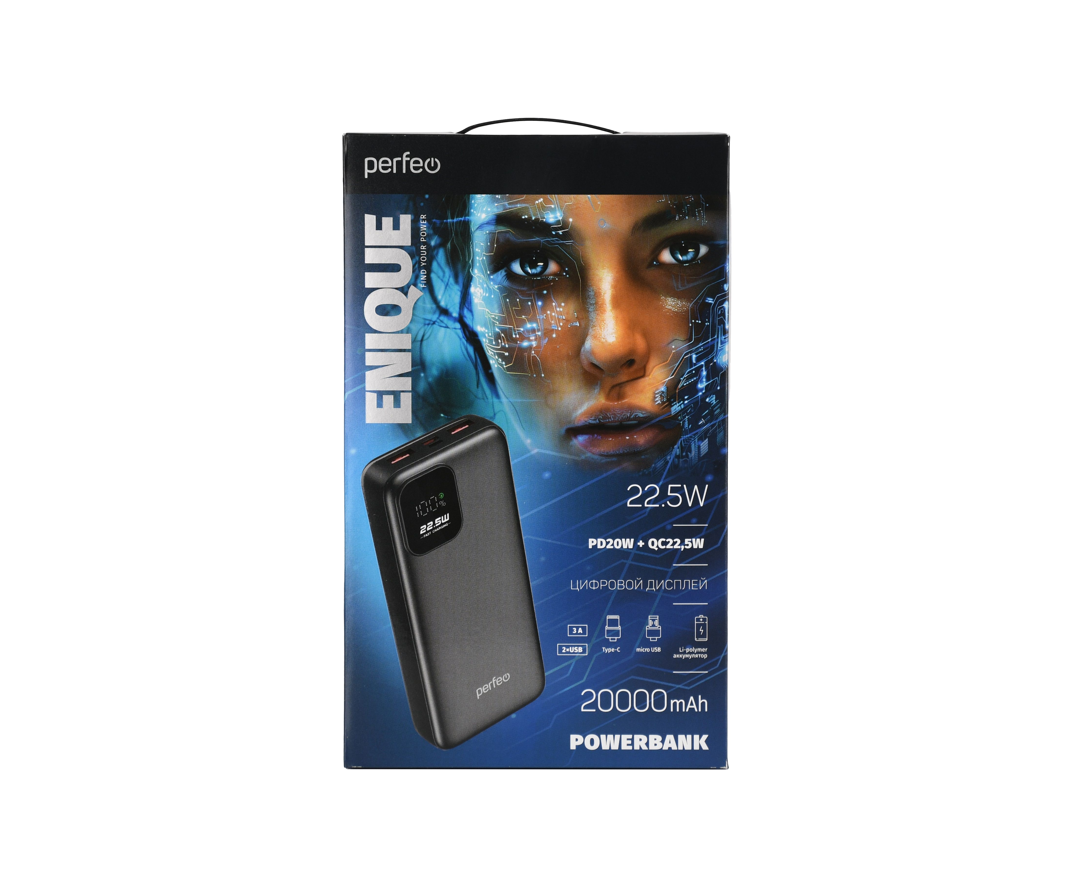 Повербанк Perfeo 20000 mAh/LED дисплей/PD + QC 3.0/Type-C/2 USB/Выход: 5A, max 22.5W/ Черный