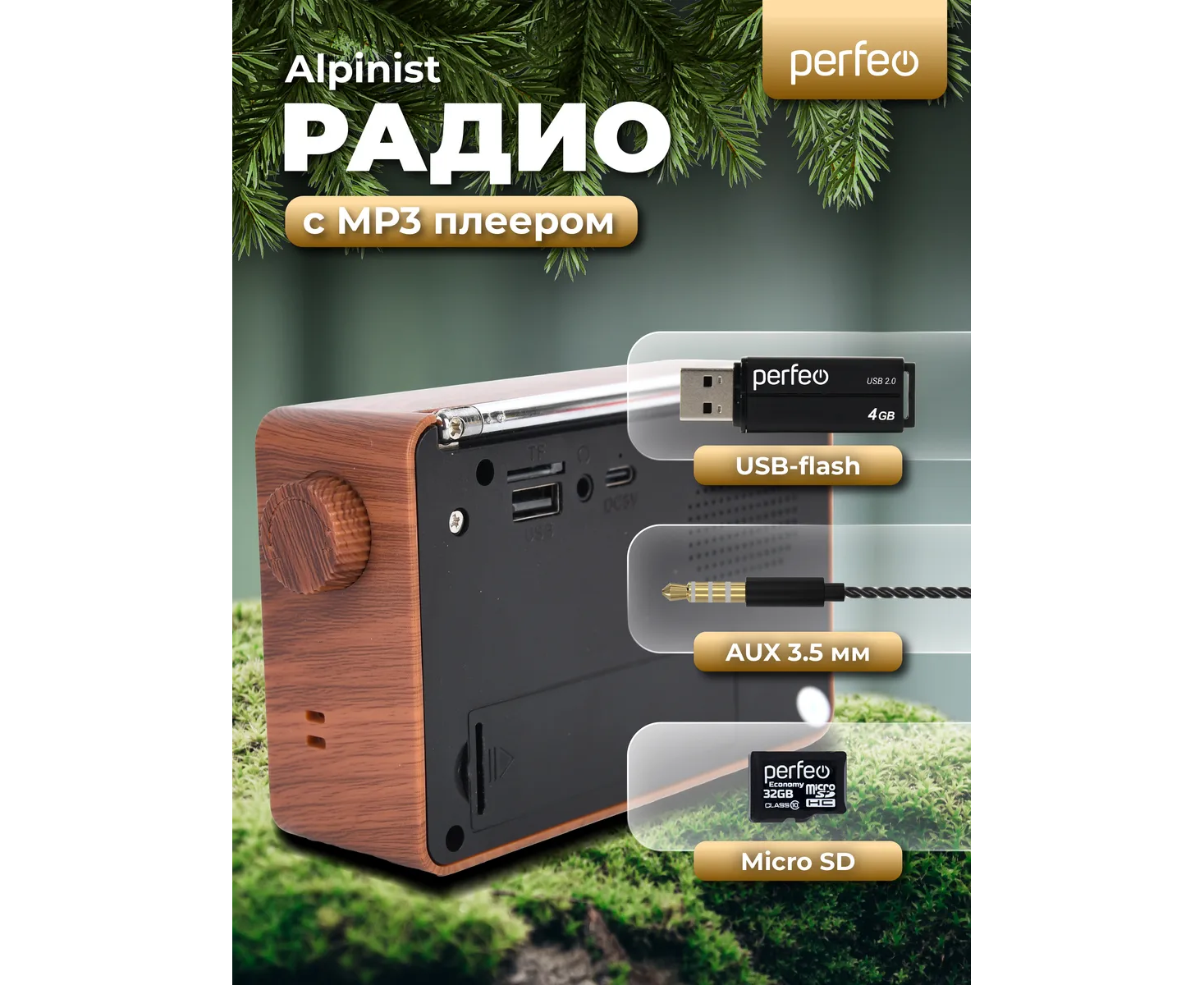 Радиоприемник цифровой Perfeo ALPINIST FM+ 70-108МГц/ MP3/ питание USB или 18650/ Коричневый, (Арт. PF_D0573)