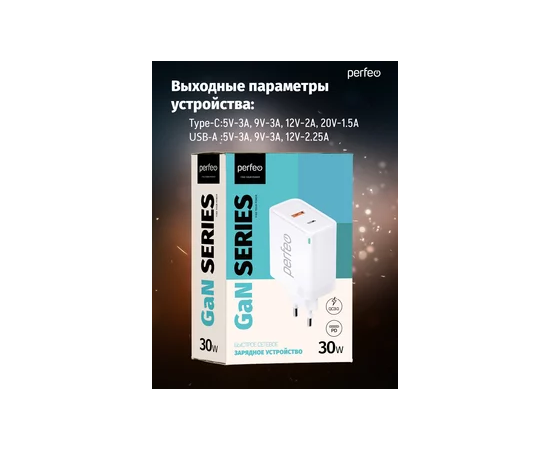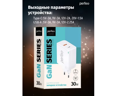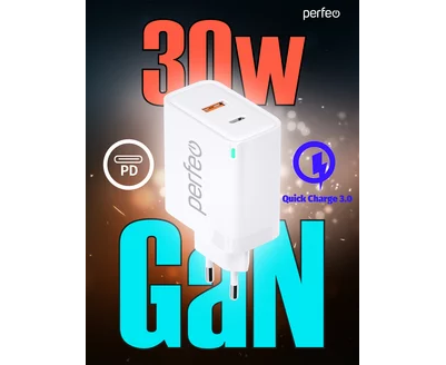 Сетевое зарядное устройство с двумя разъемами PERFEO USB-A+TYPE-C, GaN, 30W, белый (I4653)