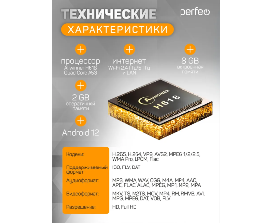 Приставка Perfeo SMART TV BOX "VISION 2/8", Allwinner H618, Android 12, 2Gb/8Gb, Пульт Bluetooth, (Арт. PF_A4559-C)