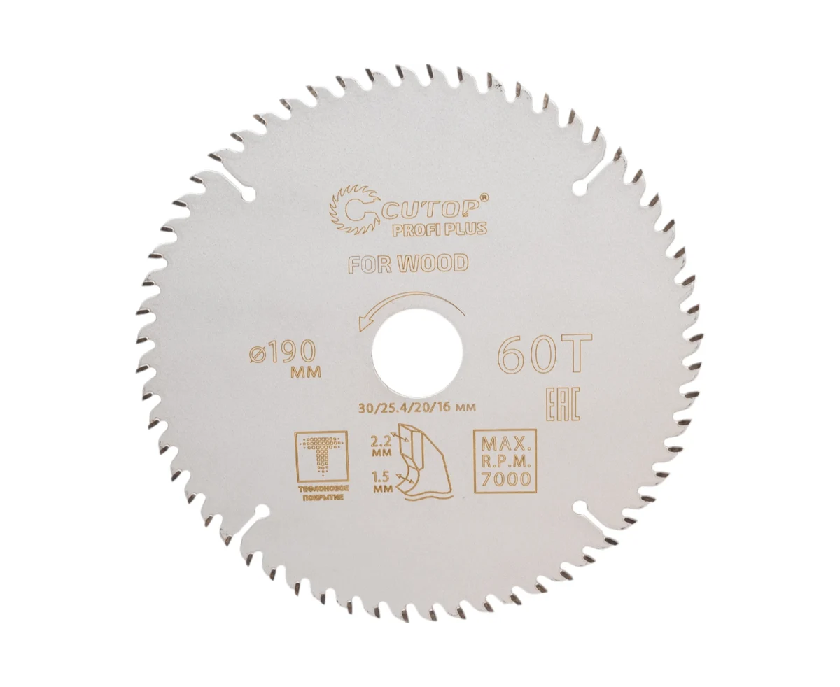 Диск пильный с тефлоновым покрытием по дереву Profi plus 190x1.5/2.2x30/25.4/20/16 мм, 60Т CUTOP 75-19060Т используется совместно с циркулярными и торцовочными пилами для продольного и поперечного реза. Предназначен для распила мягких и твердых пород древесины, МДФ, фанеры.