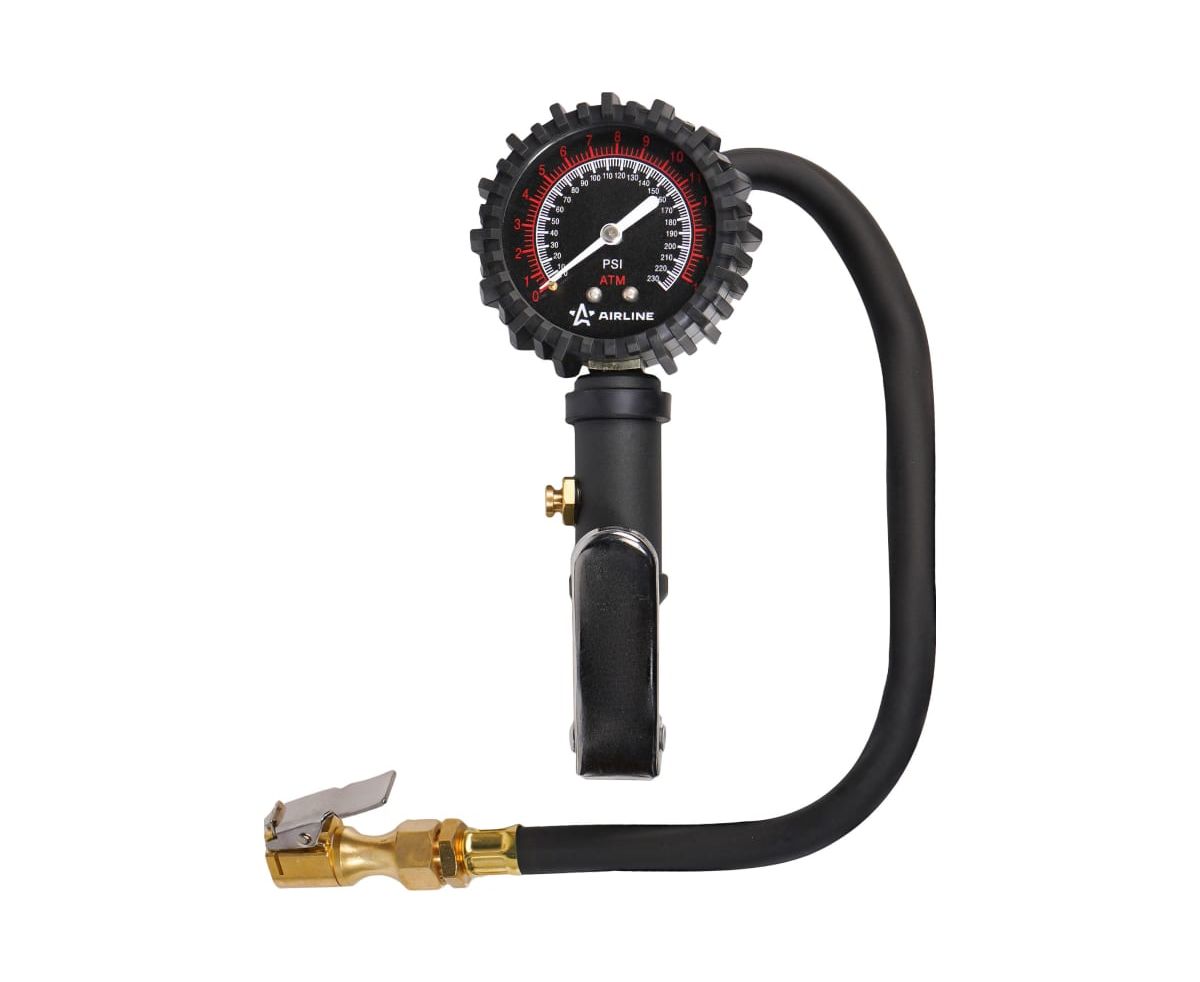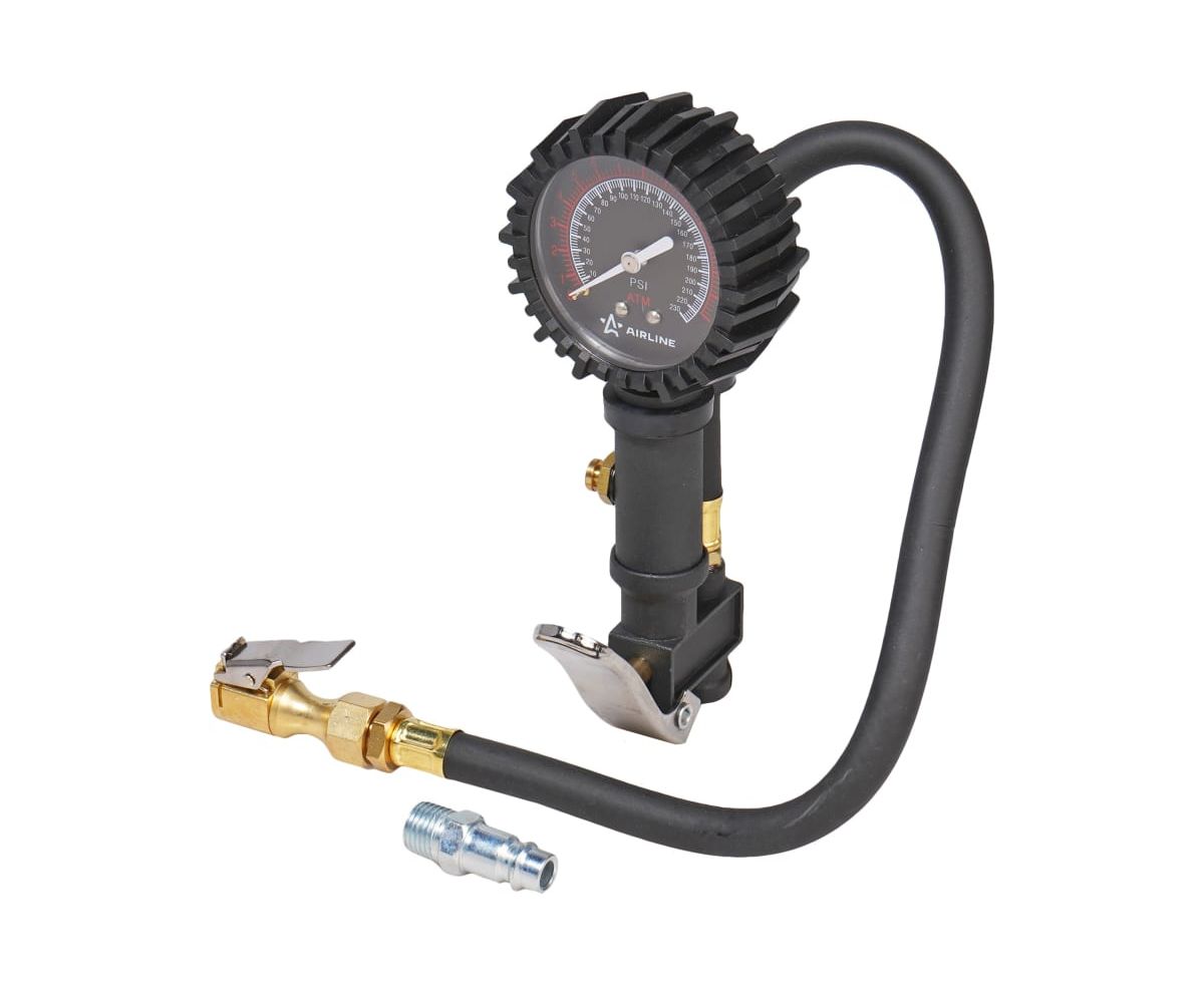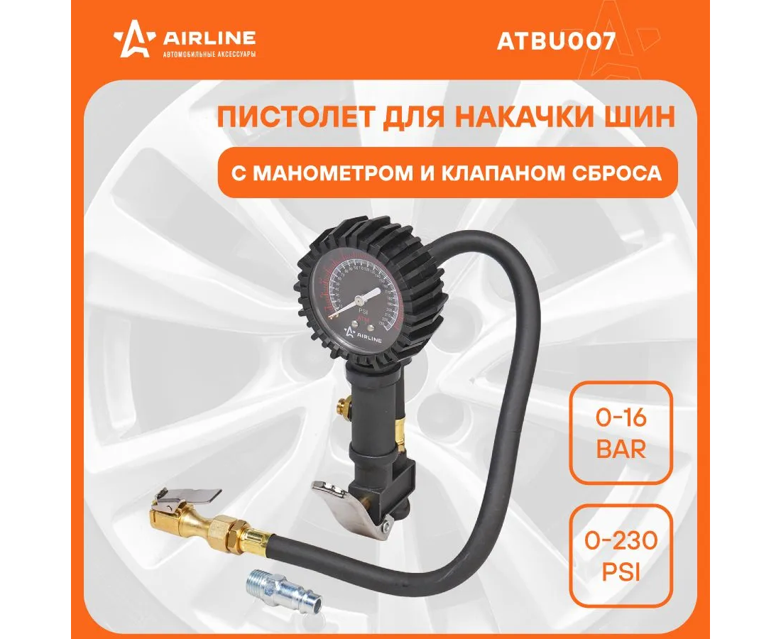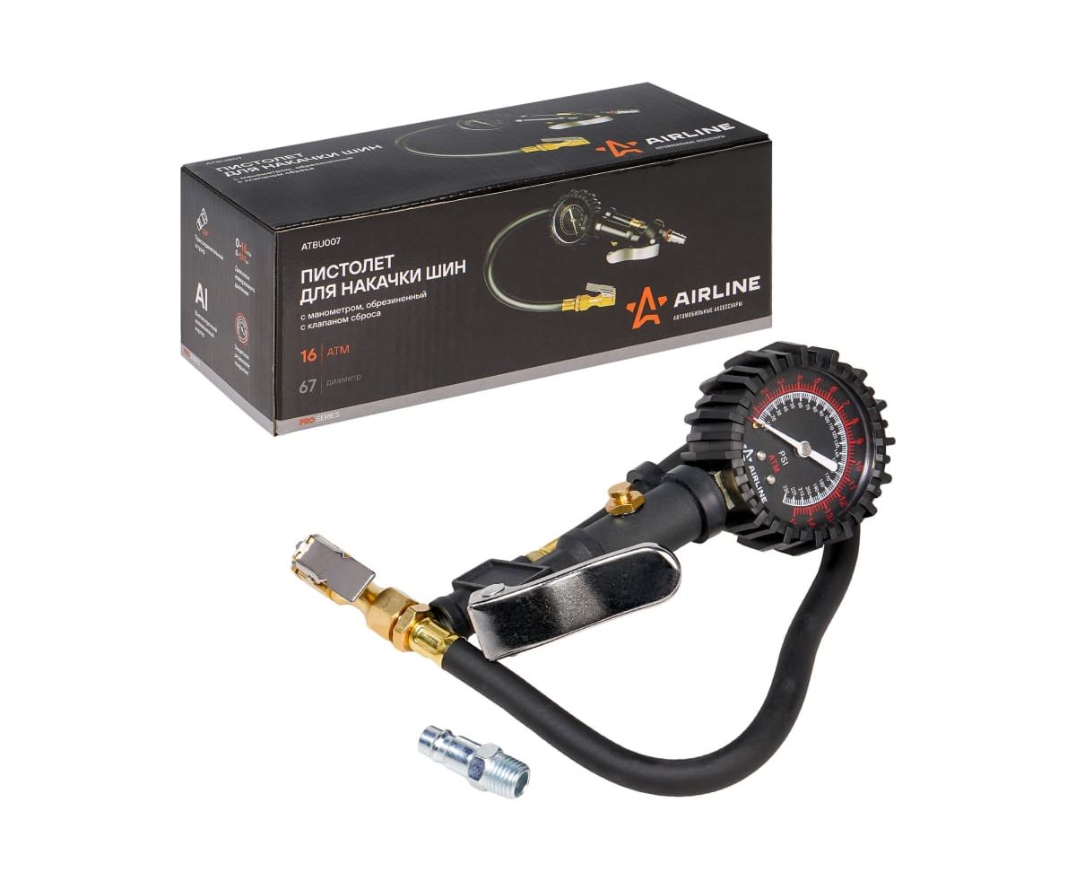 Пистолет для накачки шин с манометром Airline PRO 16АТМ, с клапаном сброса ATBU007 изготовлен из алюминиевого сплава. Манометр защищён резиновым чехлом.