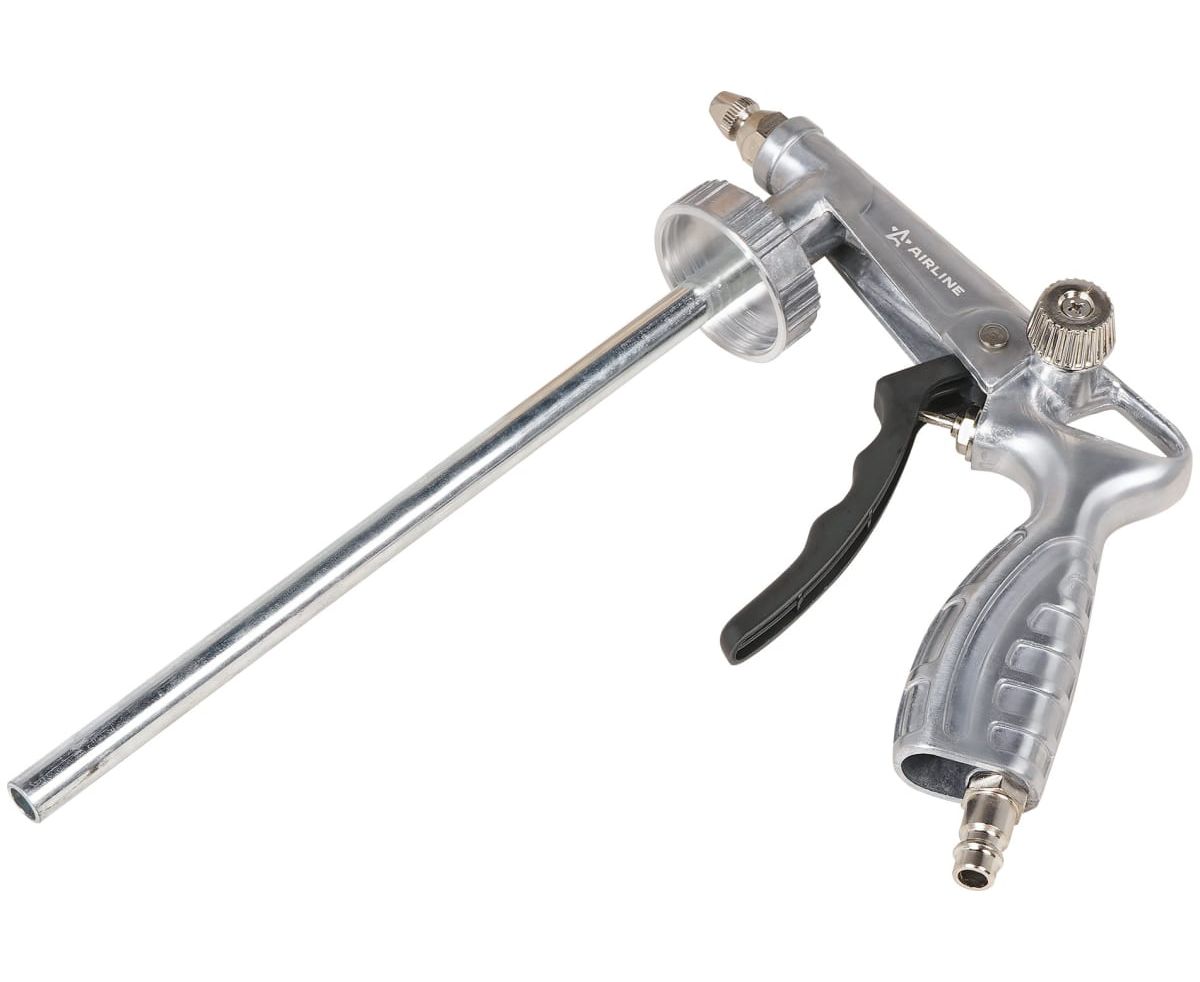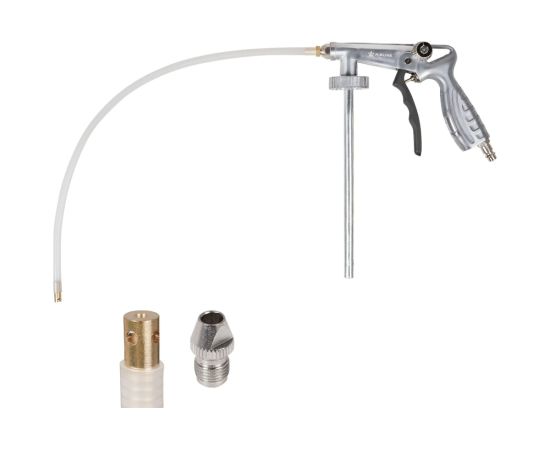Пистолет изготовлен из металла. Имеет стандартное присоединение под евробаллон и гибкое сопло для нанесения составов в скрытых полостях и труднодоступных местах. Конструкцией пистолета предусмотрена регулировка расхода воздуха.