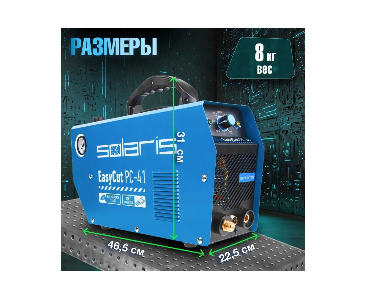 Плазморез SOLARIS EasyCut PC-41 используется для работы с различными токопроводящими материалами: углеродистая сталь, нержавеющая и оцинкованная сталь, алюминий, медь и пр. Устройство поможет выполнить резку металла с большой скоростью и высоким качеством среза. Высокочастотный поджиг дуги обеспечивает плавный и качественный старт. Одной из главных особенностей аппарата является регулировка продувки после резки до 20 секунд.